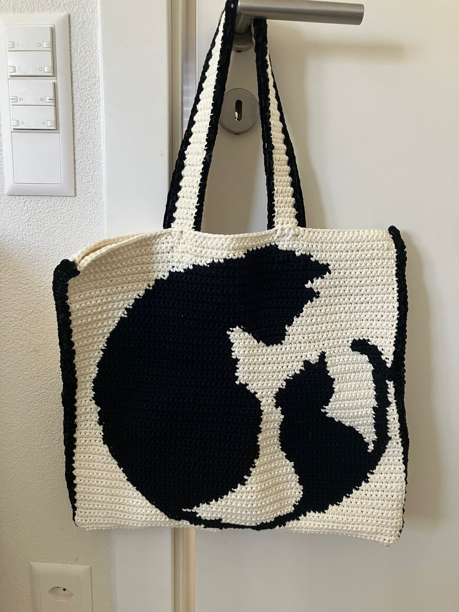 I found on pinterest the scheme to follow to make the image (I think it was a cross stitch pattern) and I followed it with crochet (not sure it was a good idea , but it almost worked). then I assembled the 2 panels and I added the handles