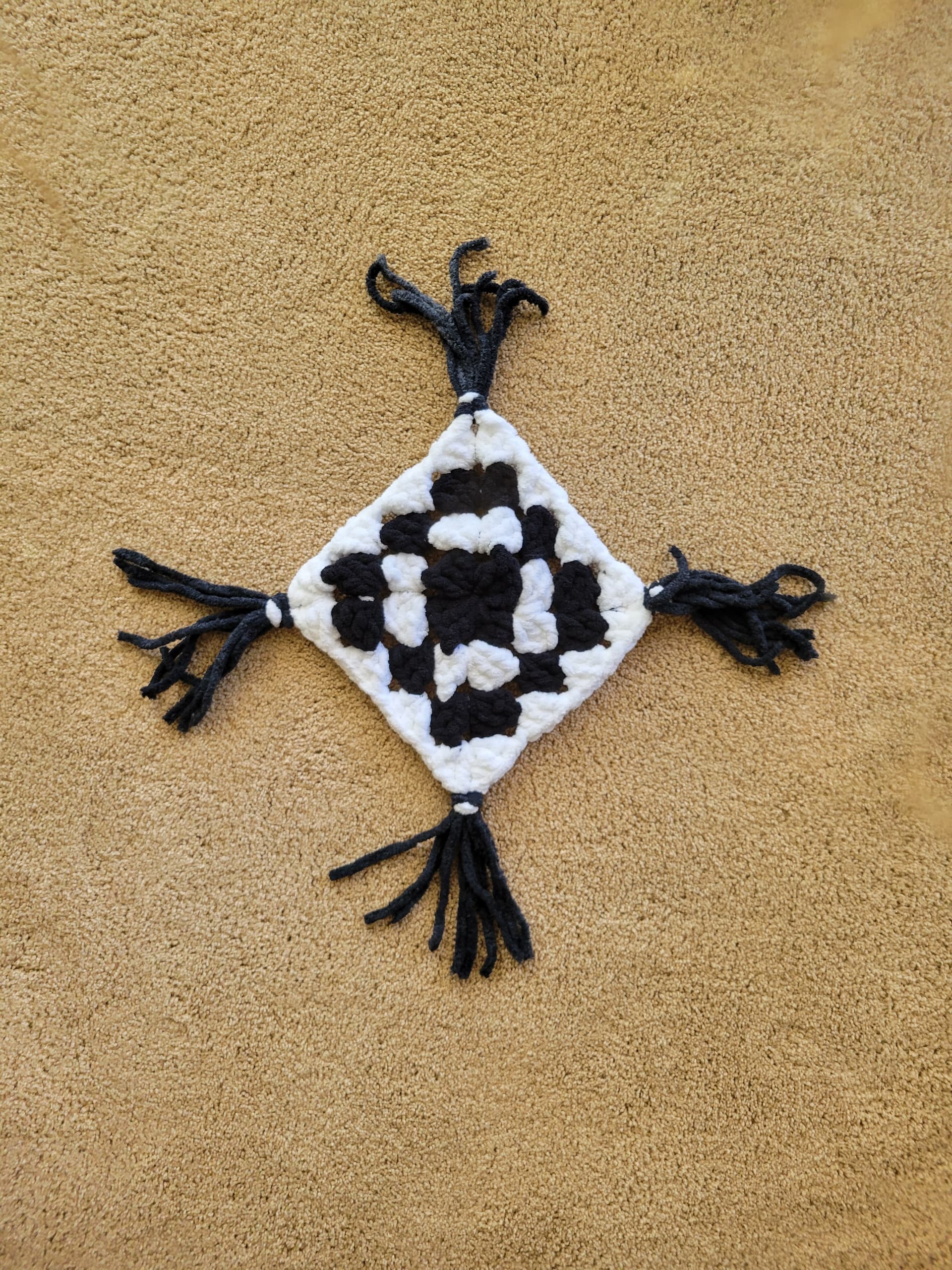 You can make one of these to hang on ur wall. Itβs basically a granny square with fringes