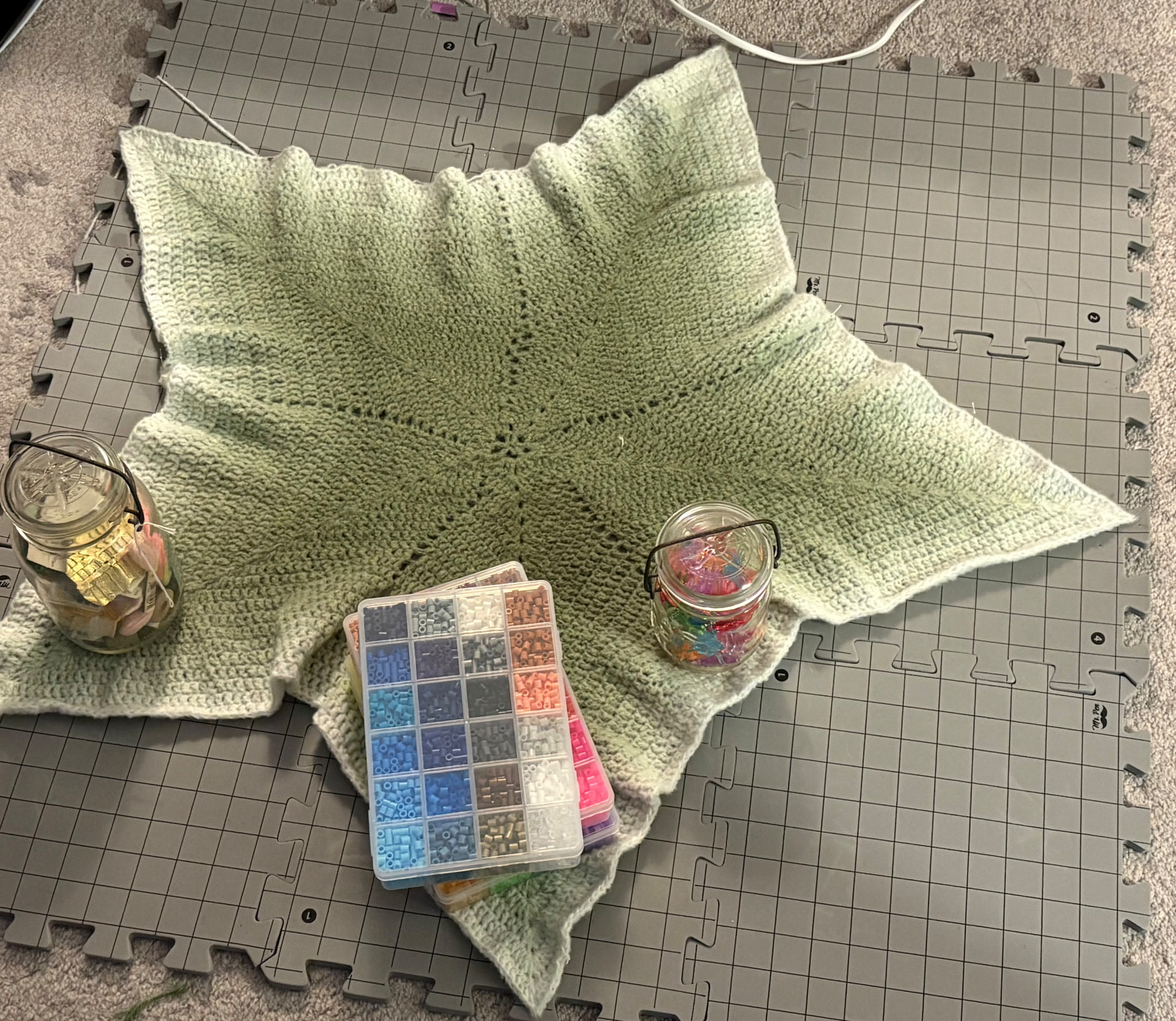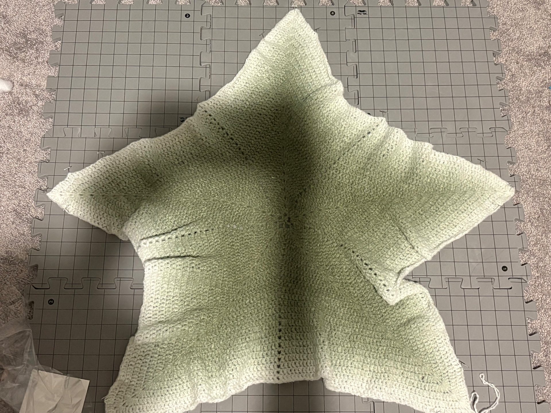 Spread the blanket over your blocking mats, gently pulling it into shape. If the blocking mat isn’t big enough you can use folded towels etc to enlarge the surface as needed.