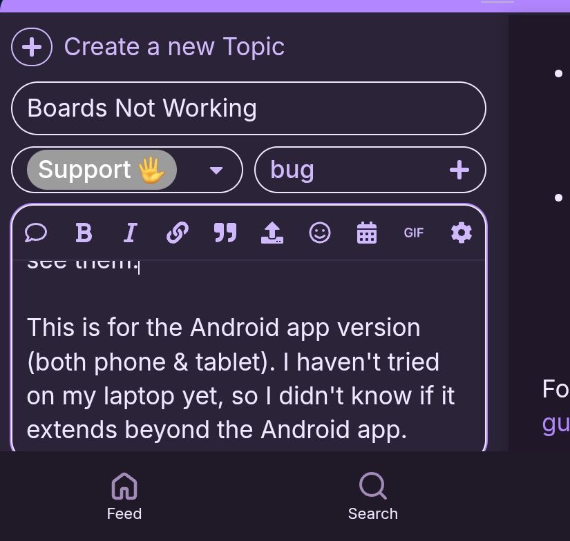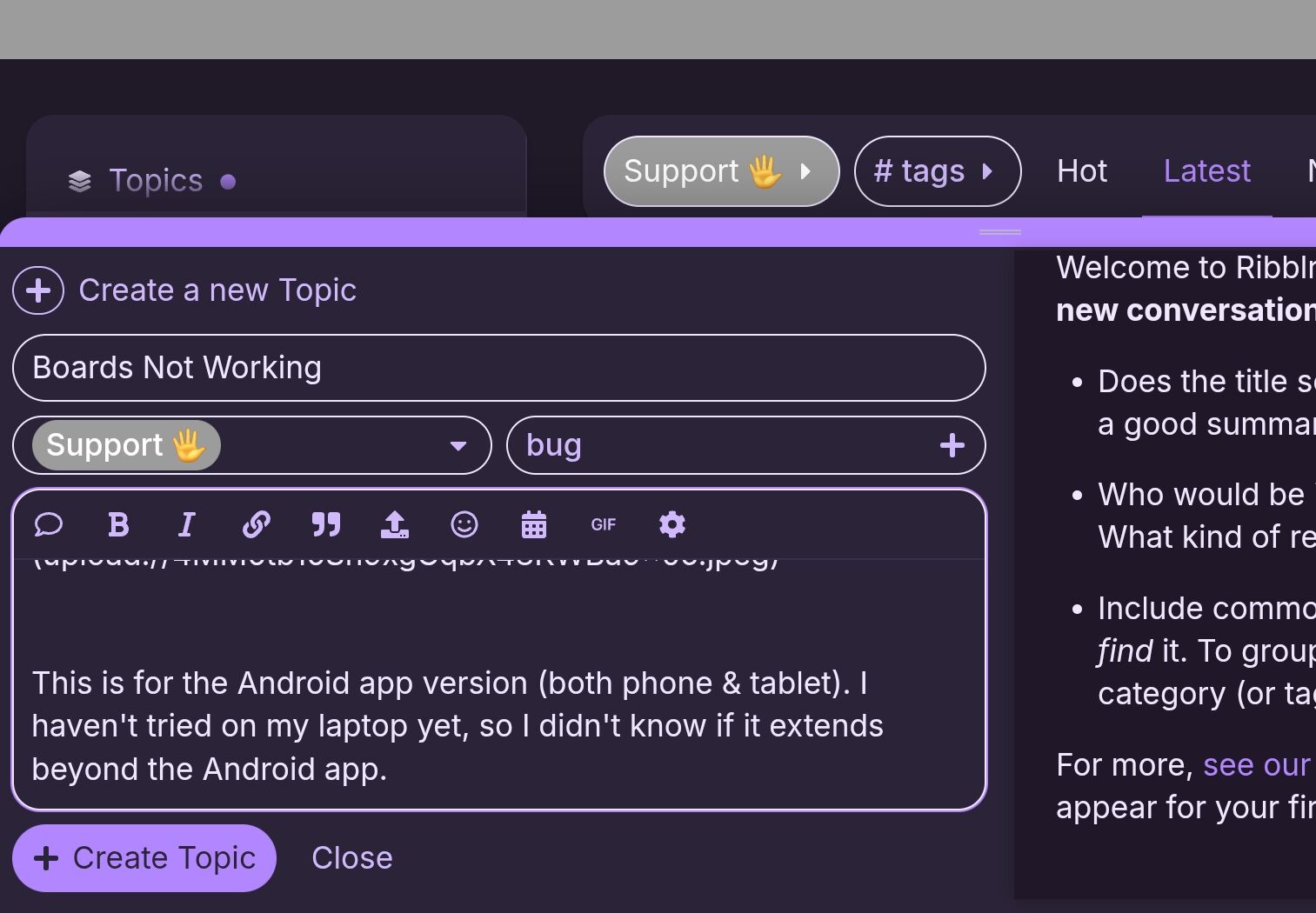 Oh, also, I just discovered that the portrait orientation cuts off the bottom of the ācreate topicā window. I have to turn my tablet/phone to landscape to see them.