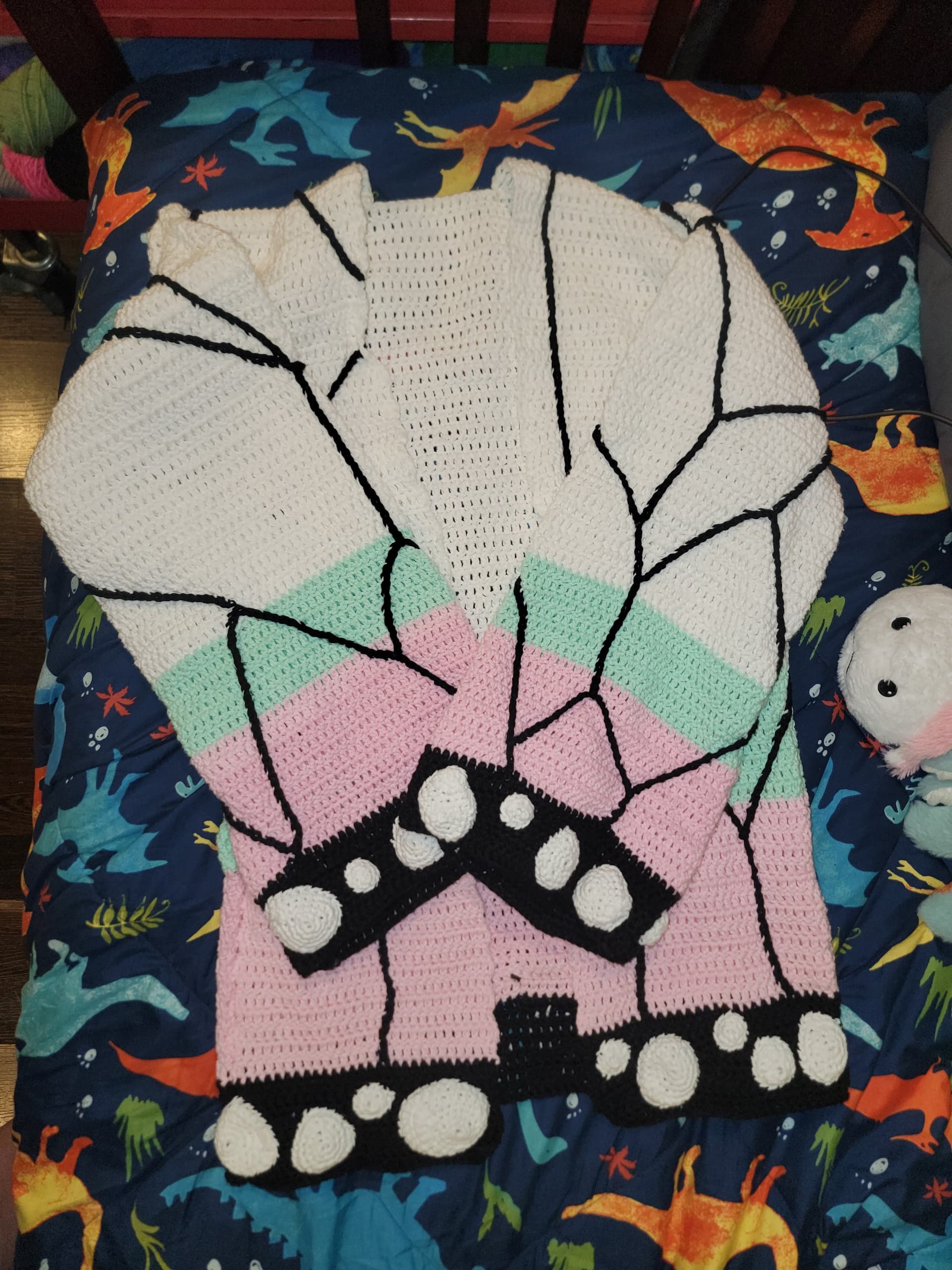 hello everyone! as you can see by the title, I’ve finished the cardigan! i worked on it from around 2 in the afternoon to 9 pm with a break for dinner in there somewhere. it was quite monotonous to finish, but im happy with the result. i plan on blocking/washing the cardigan once my color catcher sheets come in because i heard that the yarn im using (peaches & creme) can bleed and i would hate for it to be ruined from one wash. once it’s washed and dried, I’ll take better photos for y’all to see. thank you all for sticking around for the process! one final time, here’s the tutorial and my finished cardigan!