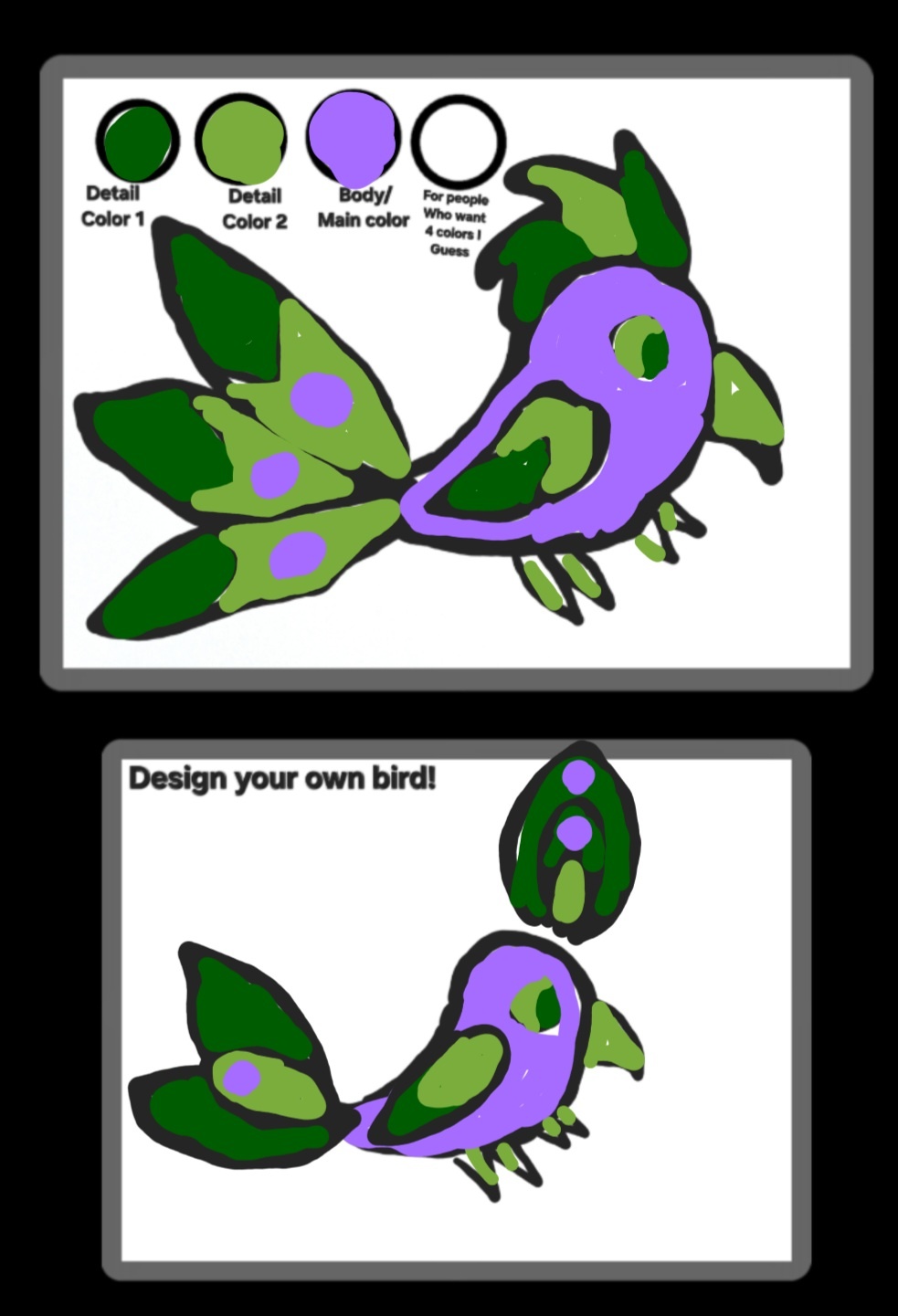 bird. I actually gave myself this color idea a while ago. I used a spinning wheel app to decide the colors. The bird’s name is Leafpollen.