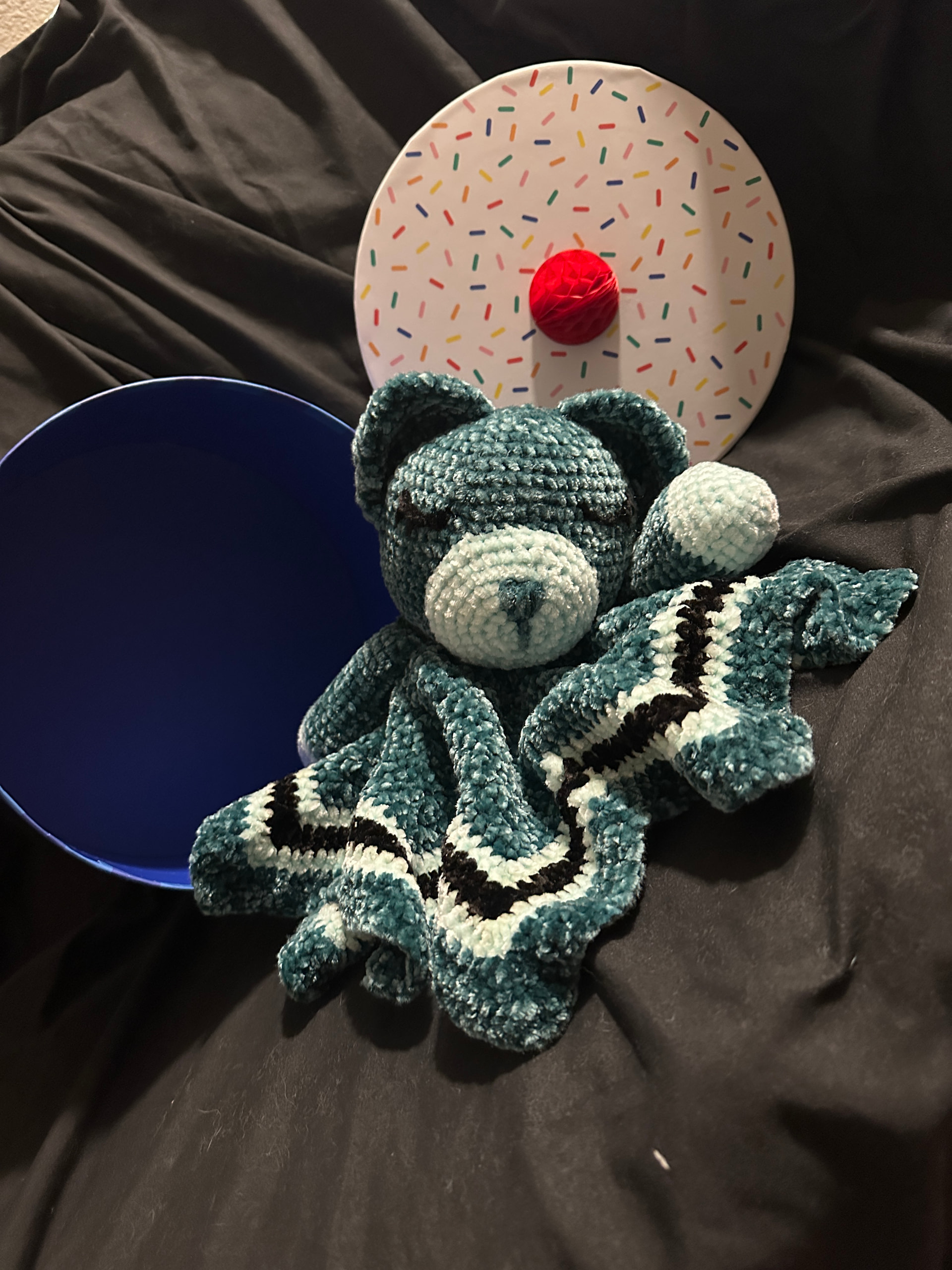 Here is a lovey I made for a coworker. The light blue is the one I mentioned I’d be using if I got ahold of the pattern!