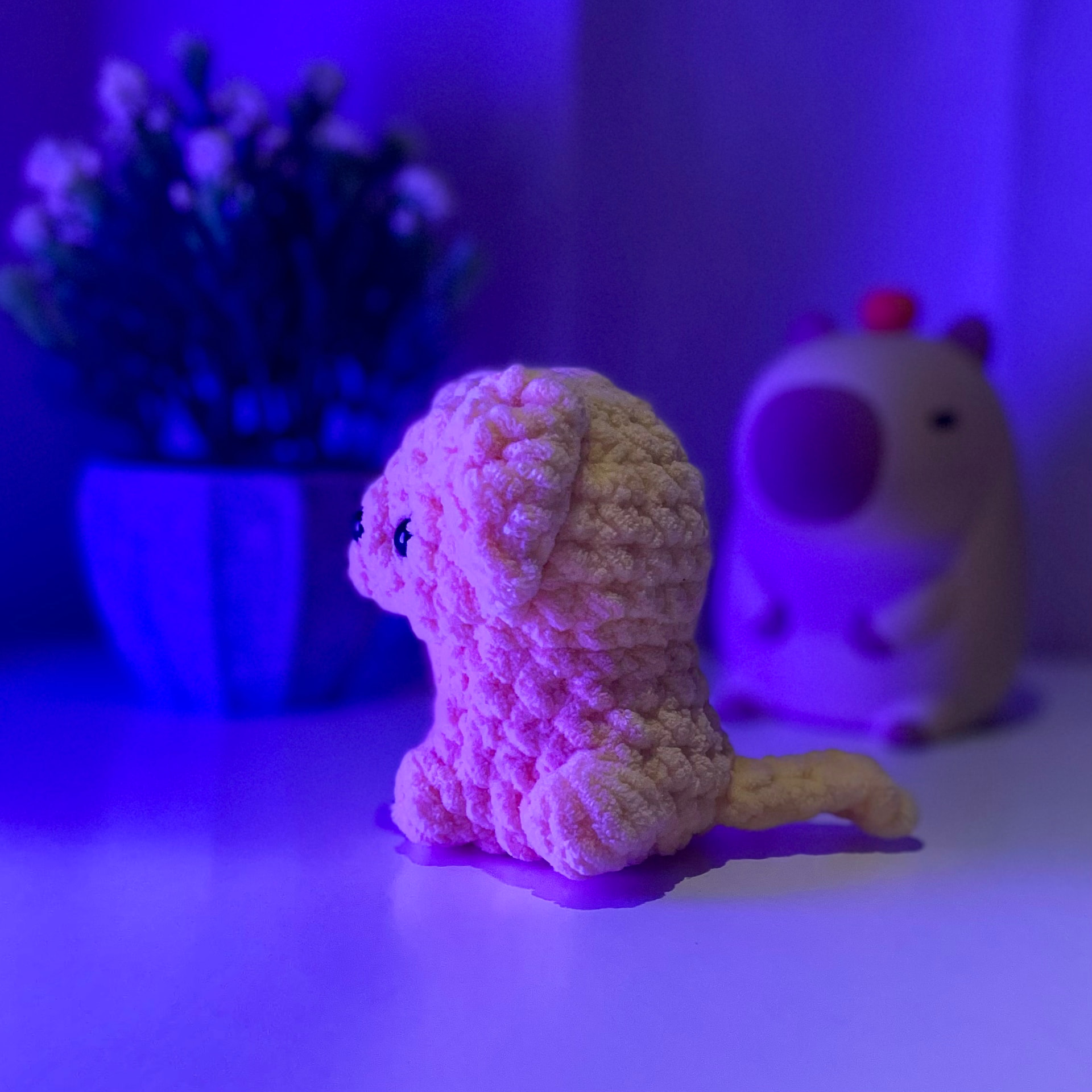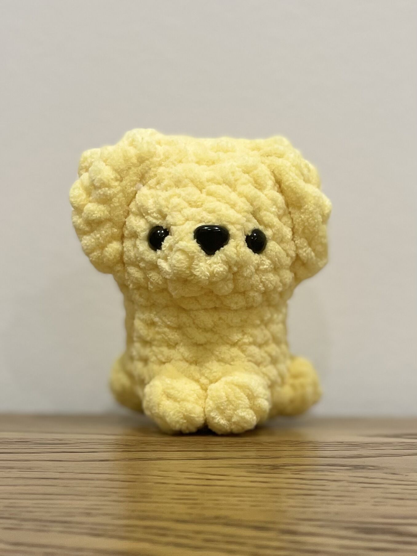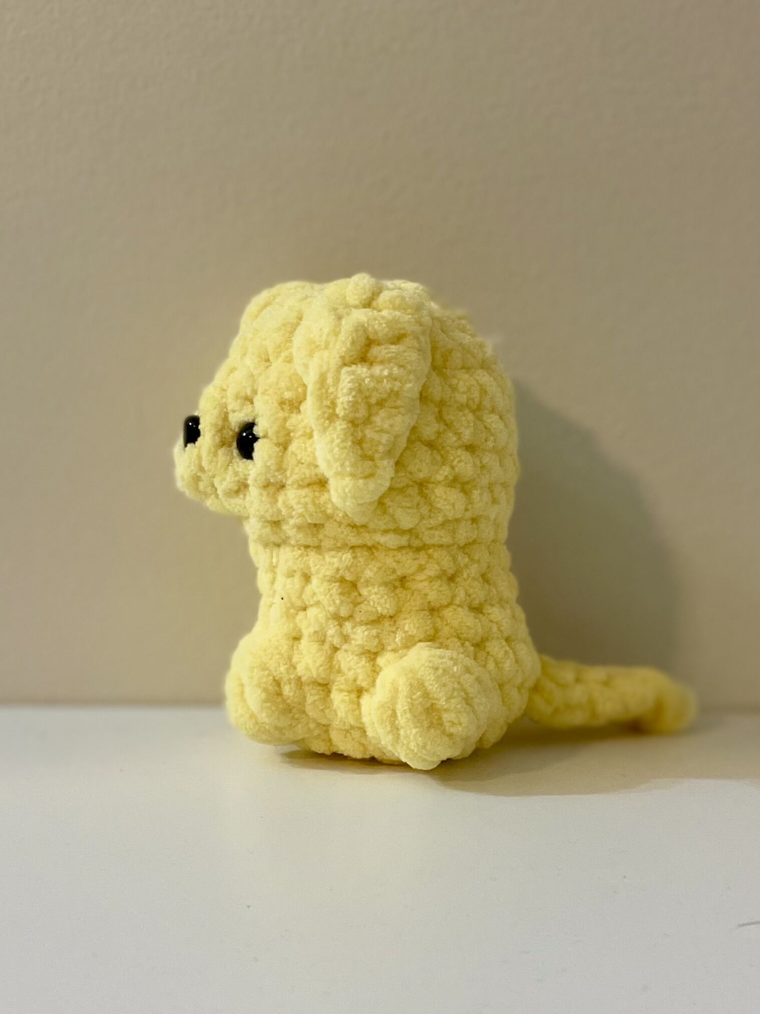 Hi! I would love to test your cute golden retriever! I will have to embroider on the nose, and I can do two sizes, thin yarn with 3mm hook, or light plush yarn with size 4mm hook! Thanks!