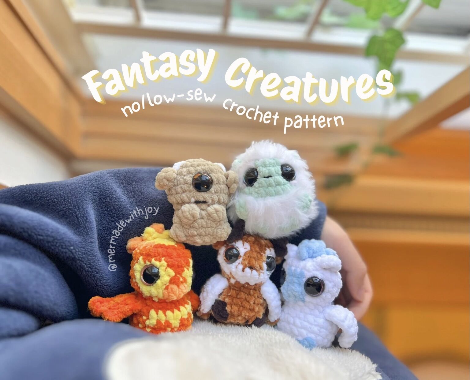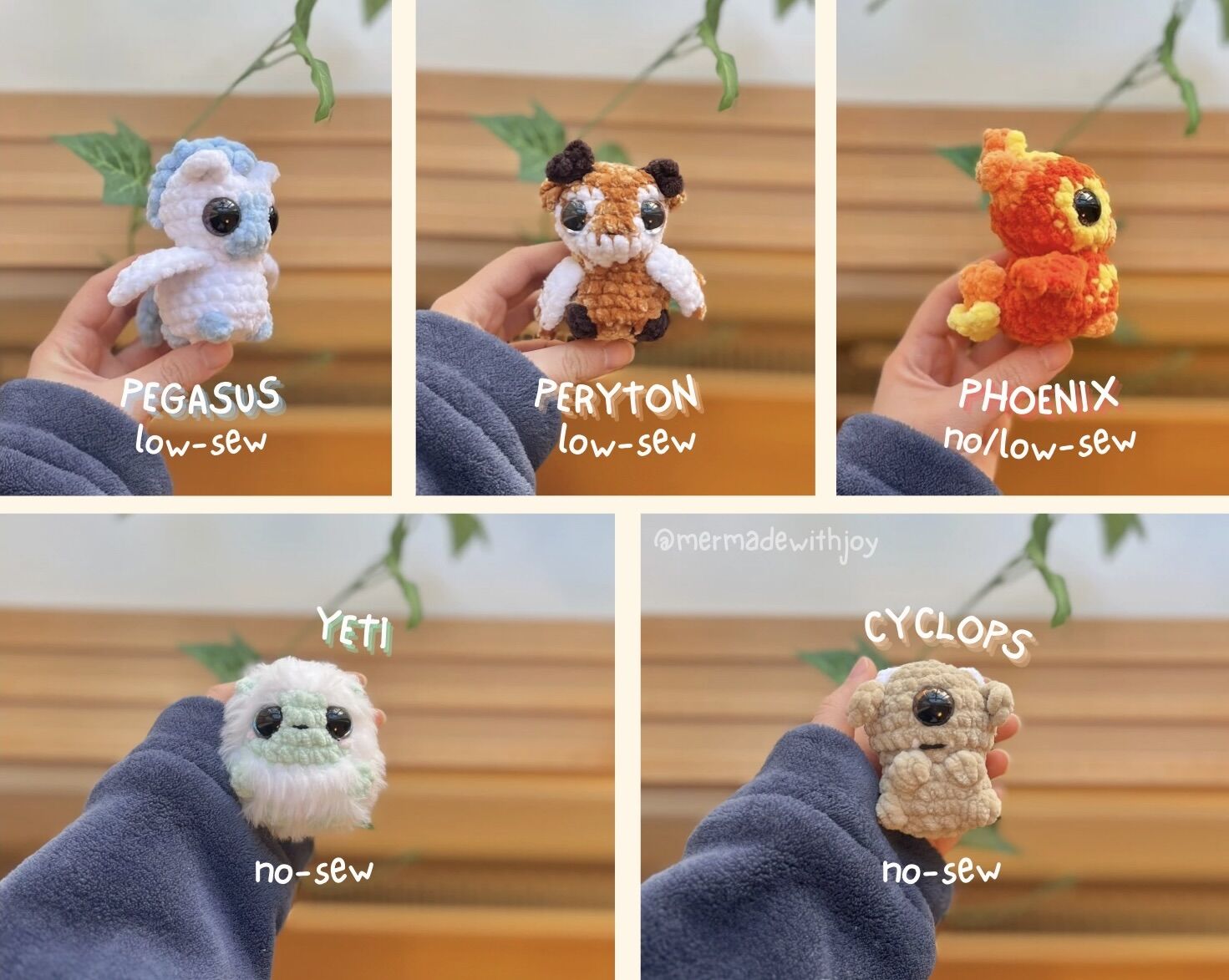 ← click this link for more photos! This bundle includes a cyclops, yeti, peryton, pegasus, and phoenix (in order of difficulty). The PDF version of this pattern is out for testing on my Instagram as well, so check out my latest post if you’re interested to apply for that! Feel free to apply to both!! (You can still choose to receive the Ribblr version after testing)