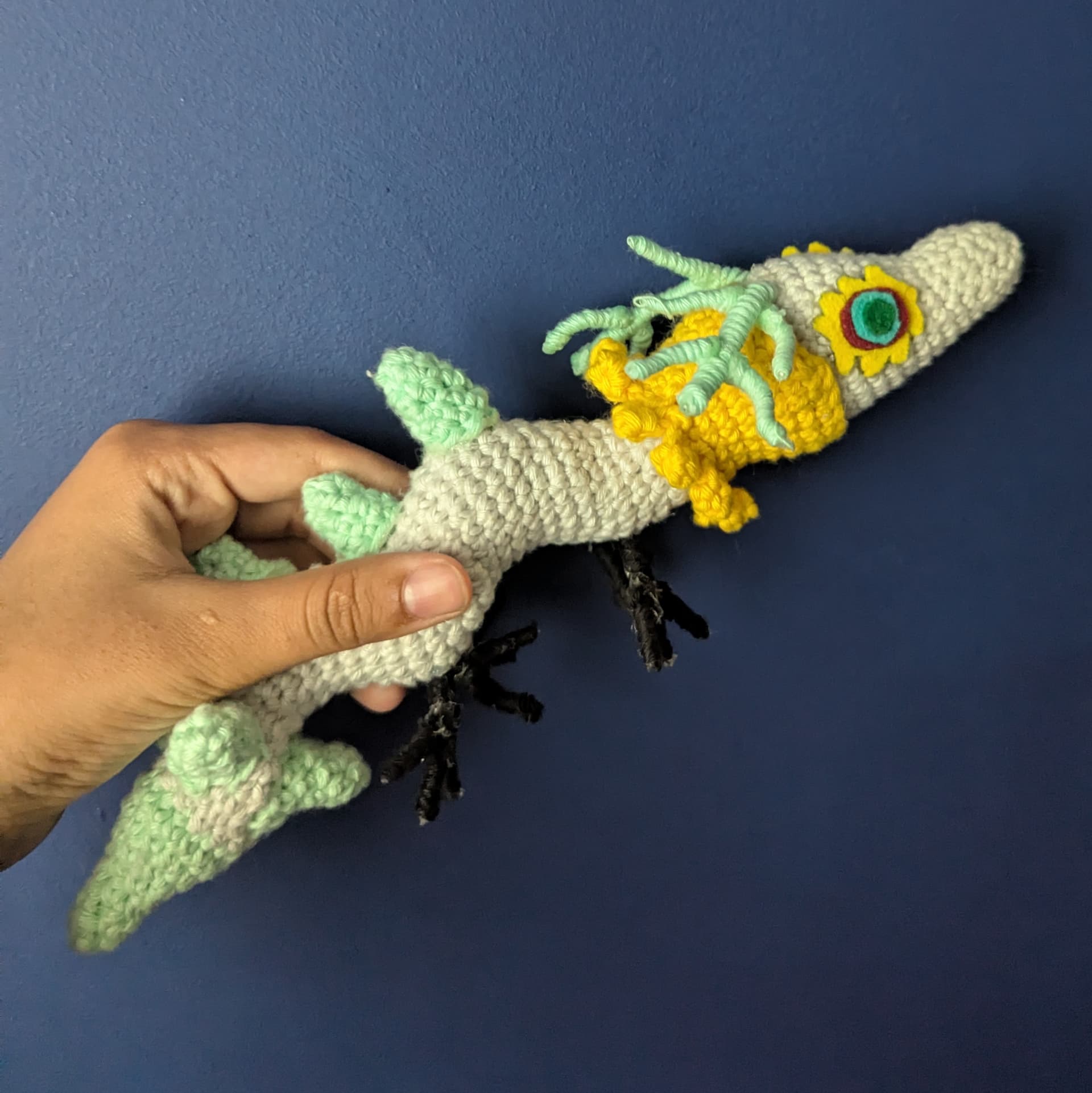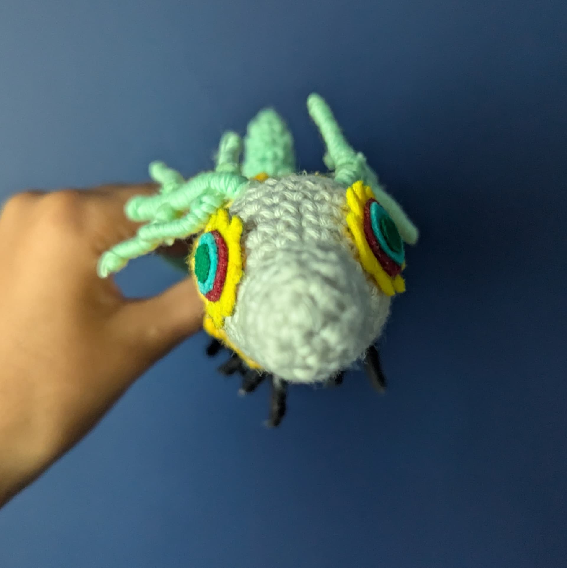 It’s so adorable!!! I’d test it with some velvet yarn with a 3.5 mm hook in its classic colours (yellow, teal, and white) along with anything else it may need!