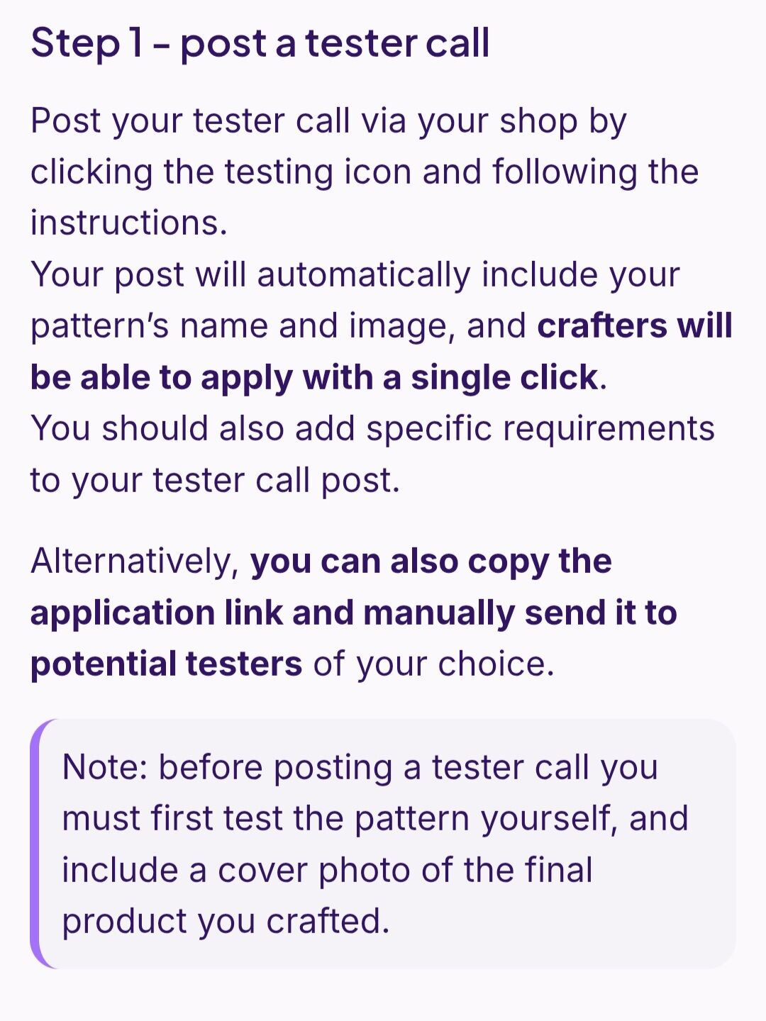 Can you add a photo of your completed whale? It is best practice to have made one yourself before posting a tester call. Also, start a group chat through your shop for any tester photos and conversation. Let me know if I can help you with that! Otherwise, the help center has valuable info on how to manage tester calls