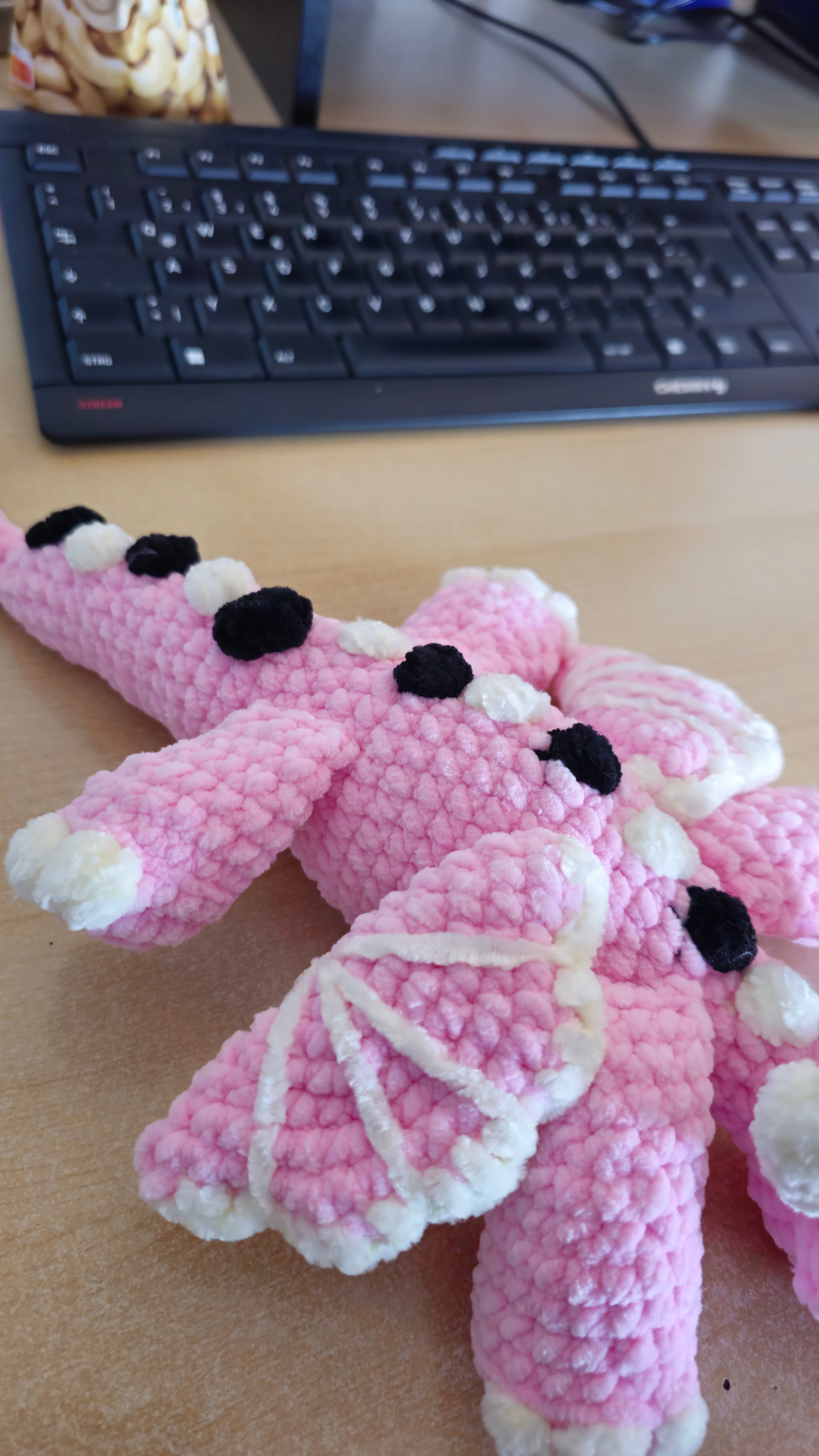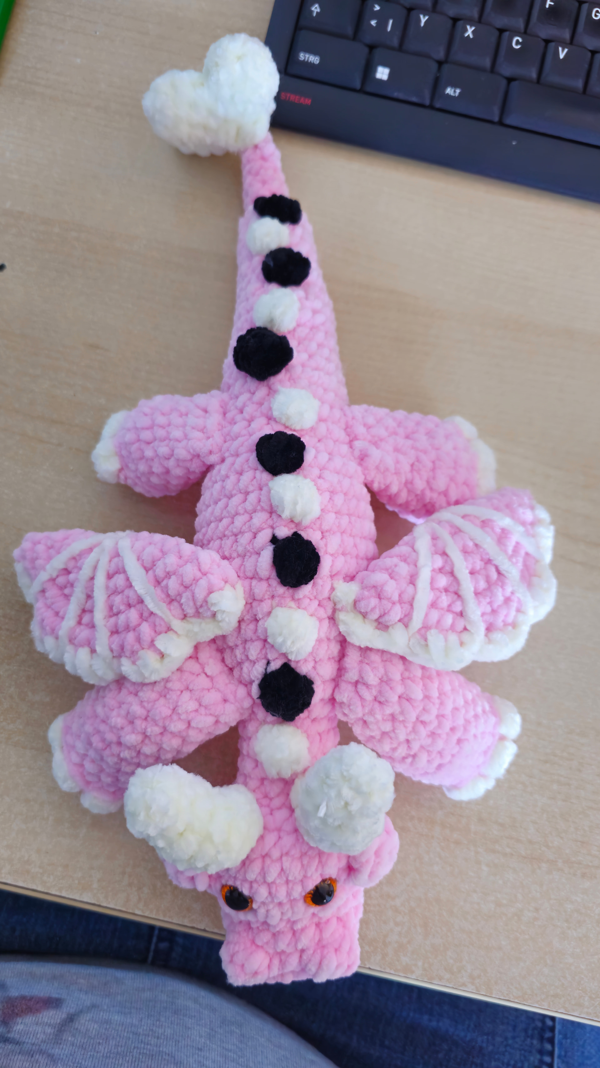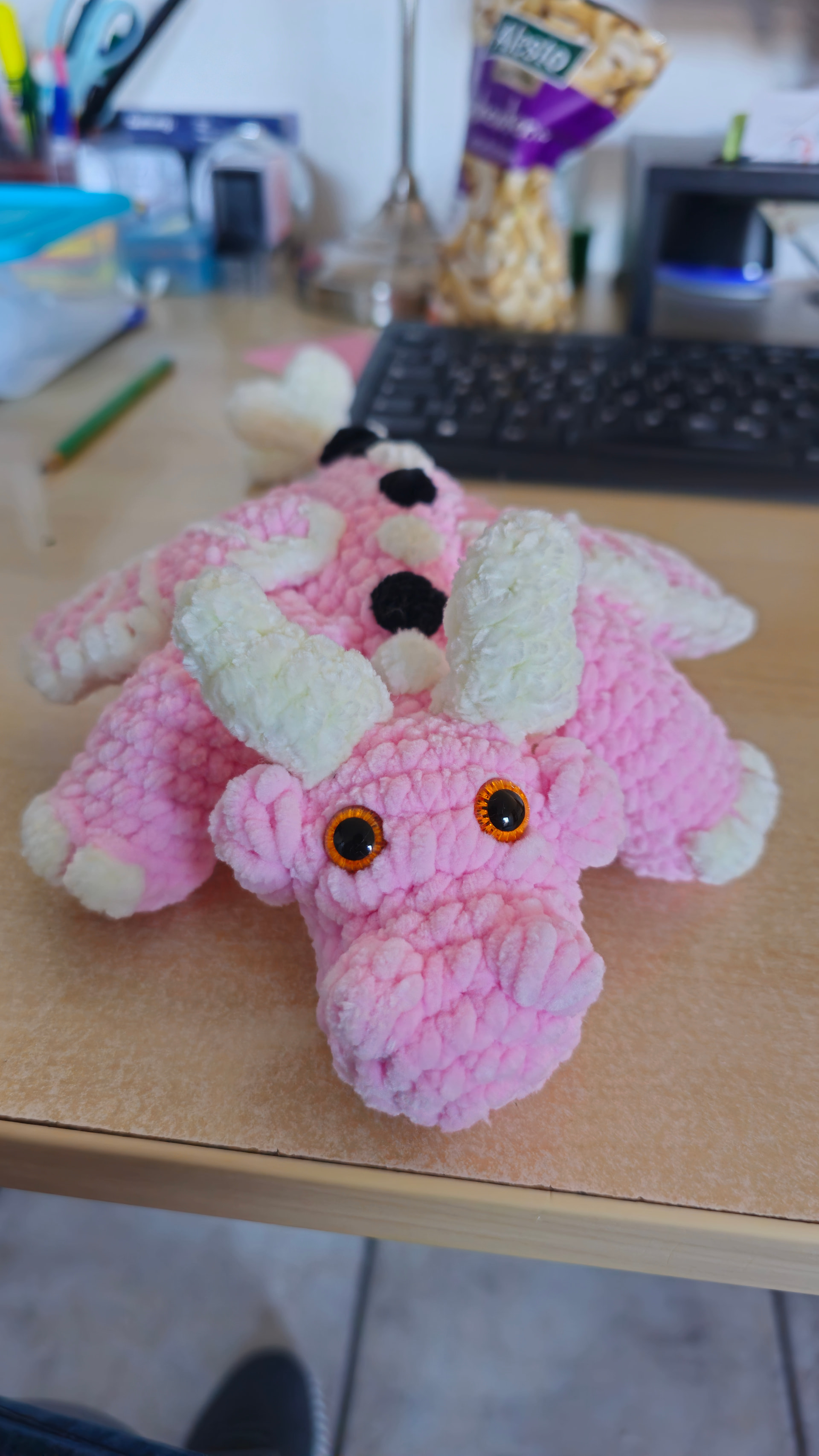 I had originally said that I would make the dragon using deep blue chenille. My son would really like it in my deep red and orange DK yarn. I can do both if it would help you to see the blue chenille.