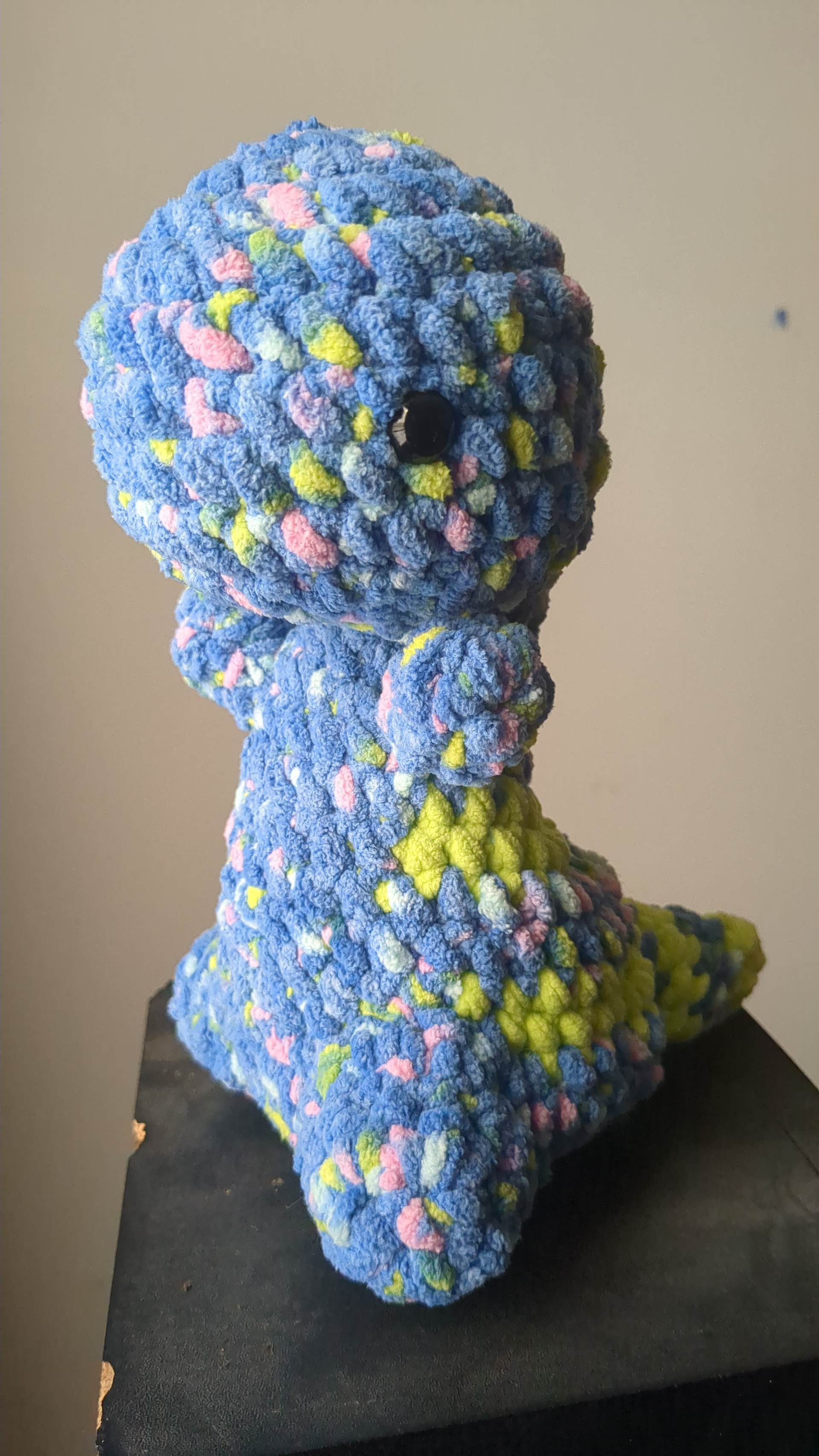 He’s so cute! For the body it would be plush grey and white, 7 hook. For the scarf I’ll use chenille red yarn, prolly a 6. . My favorite season is summer ( currently suffering). Just tested for this dino: