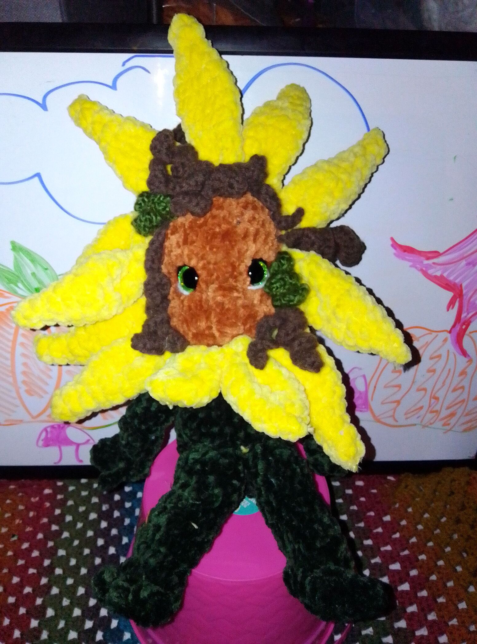 I would use super bulky chenille yarn with 10mm hook, I’m not sure what colors yet! ![]()
