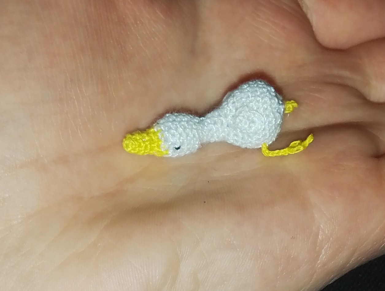 Sorry about that I would use mainly acrylic and some yarn I got second hand that I’m not sure what it is exactly and a 3.5mm hook. Here’s a mini goose that I made for a tester call recently