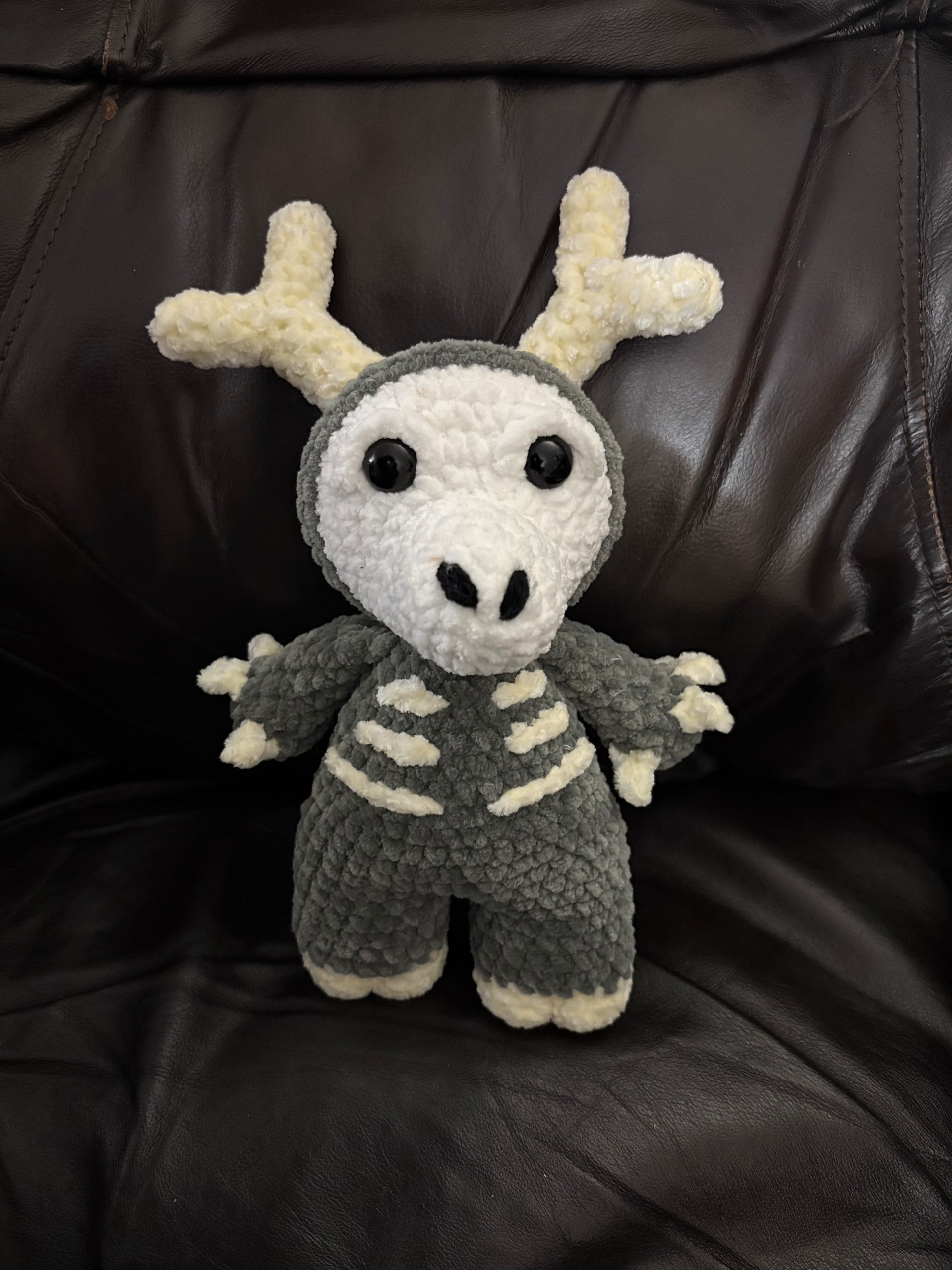 Ooh I wanna test this! I would use 4.5 lmm hook with velvet yarn in a dark grey, a cream color yarn or rainbow yarn in velvet for the horns and nails, and a white in velvet. And I’d would like to paint some sinker eyes for it.