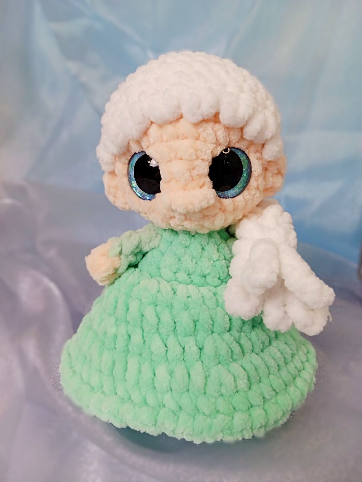 I’d use 20mm glitter sinker eyes and baby bee yarn (same colors as Elsa) I hope I can!