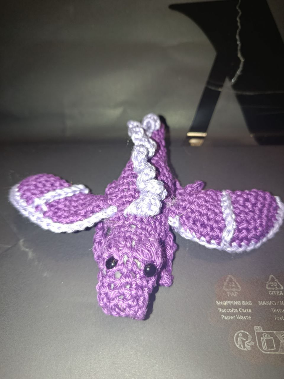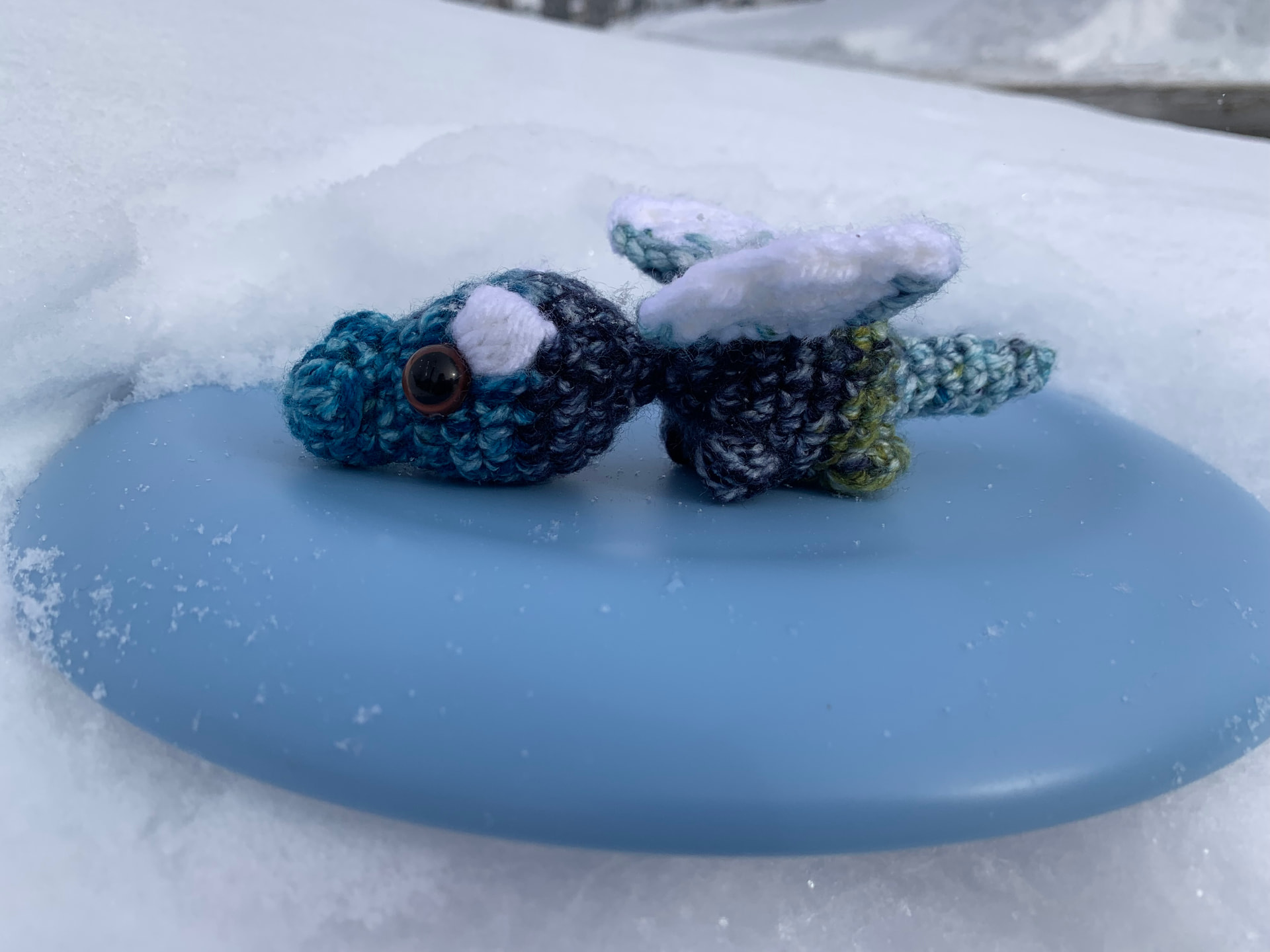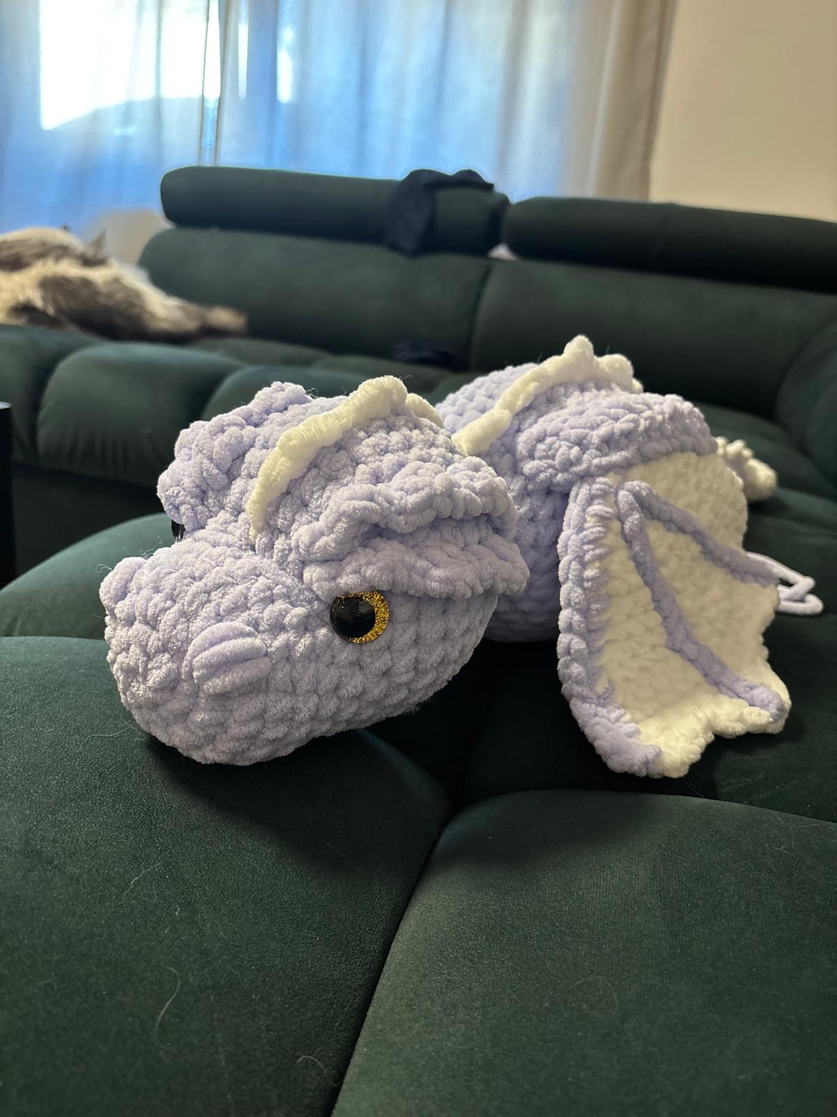 Soft acrylic yarn in multiple blue tones the last photo is the yarn Iโd use with a 3.75mm hook. And here are two other dragons in a different yarn I just tested.