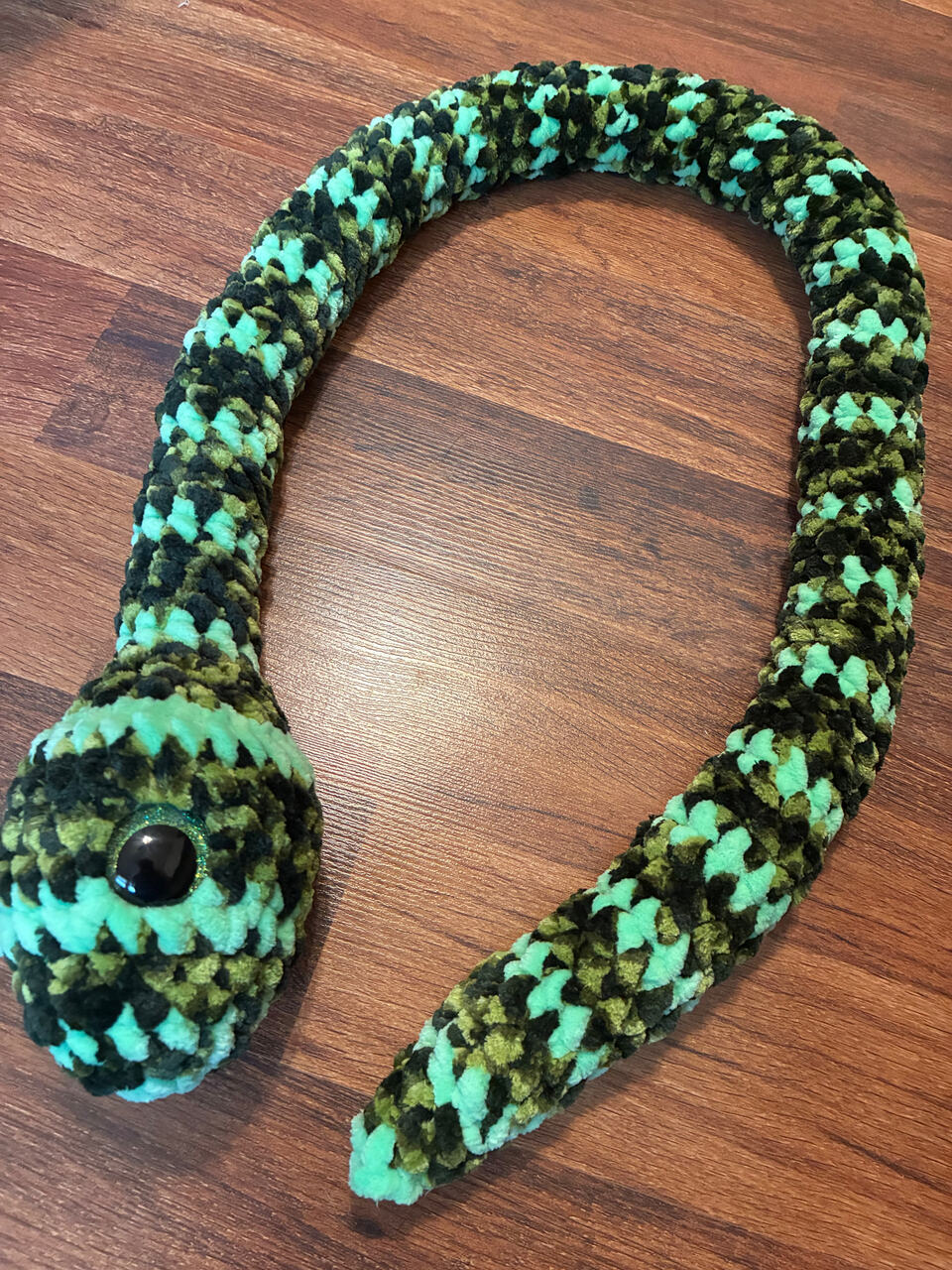 Hello! I just finished a crocheting a snake. I’m try to use up some of my yarn stash… because it is getting HUGE. So if you have any other ideas let me know. I used size 7 yarn and a 7.00mm hook. And I painted the eyes myself. It’s about 49 inches long. Let me know what I should charge for it. I was thinking $25-$30. Hope y’all have a good day! Thanks for reading! ![]()