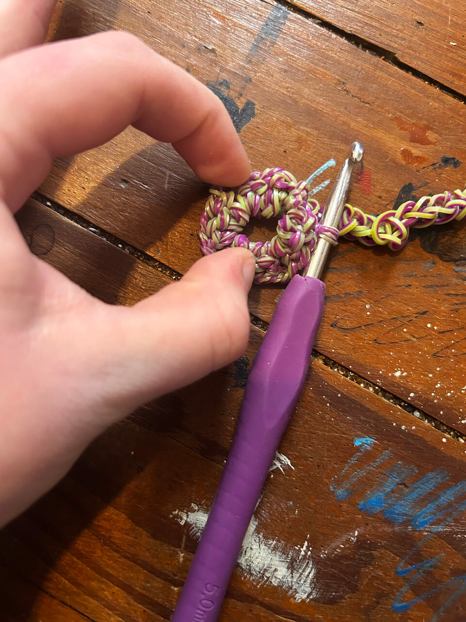 So I recently got into rainbow loom bracelet making. I’m sure many of us remember either being gifted at some point or making a rubber band bracelet at least once in our lives. If not, it’s no big deal. Well I got a really cursed idea. What if I loop a really long chain and then try to crochet a granny square with it? I did just that. I failed, but not entirely. It took me about an hour to get this far: