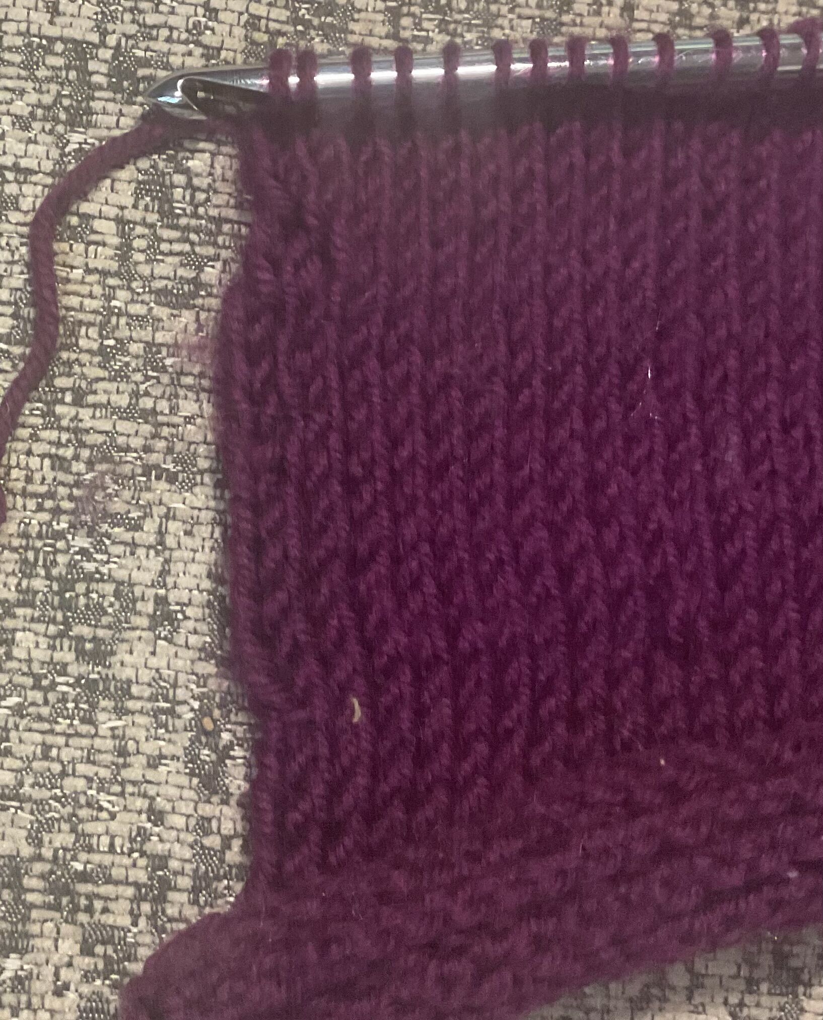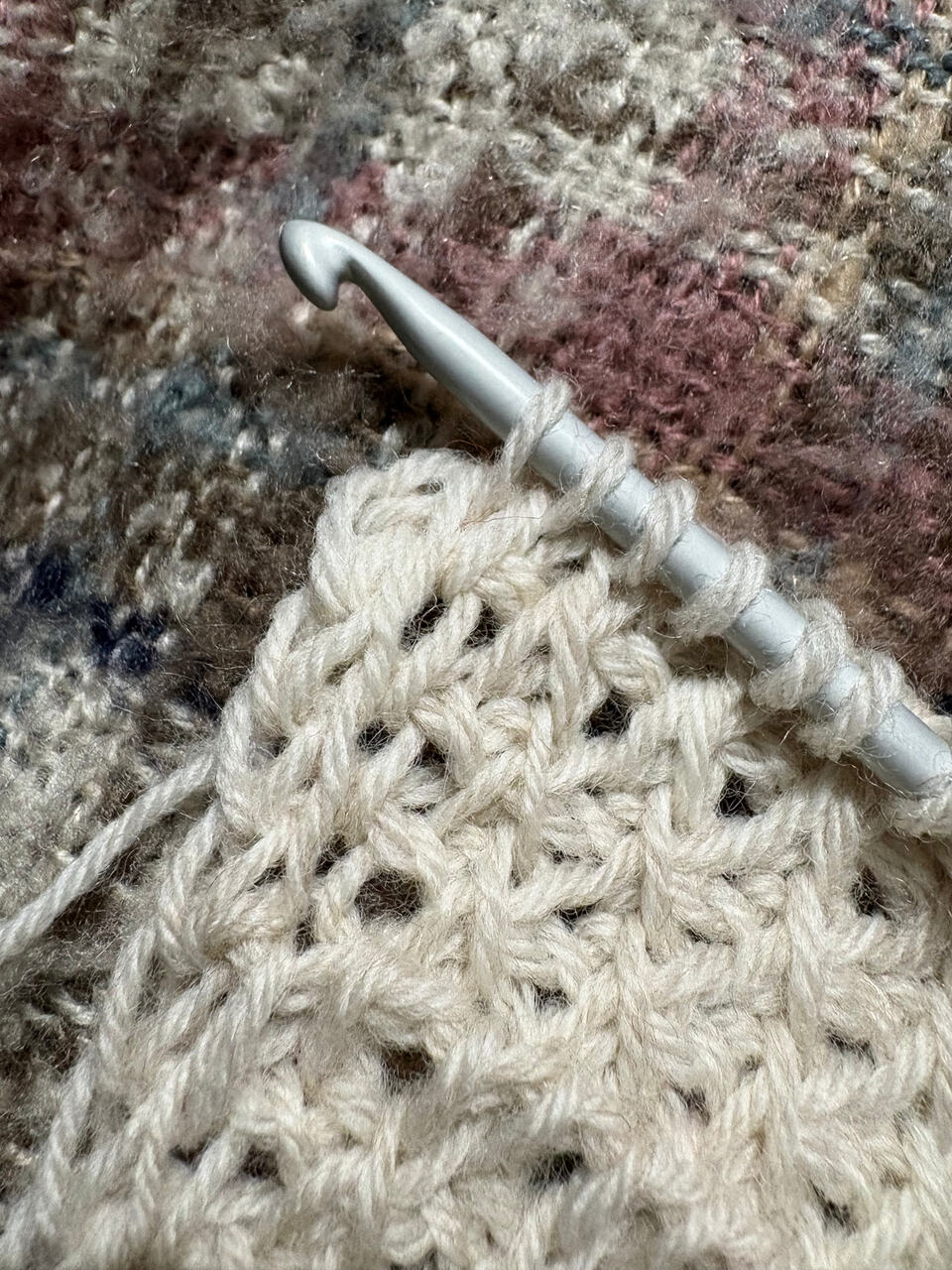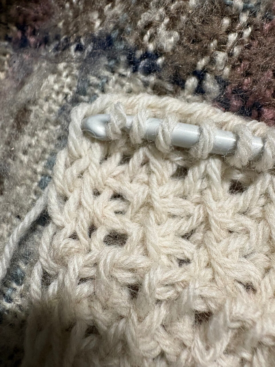 I want it to look like all the other Vs before it right? Under 2 loops but inserting in middle for knit stitch.