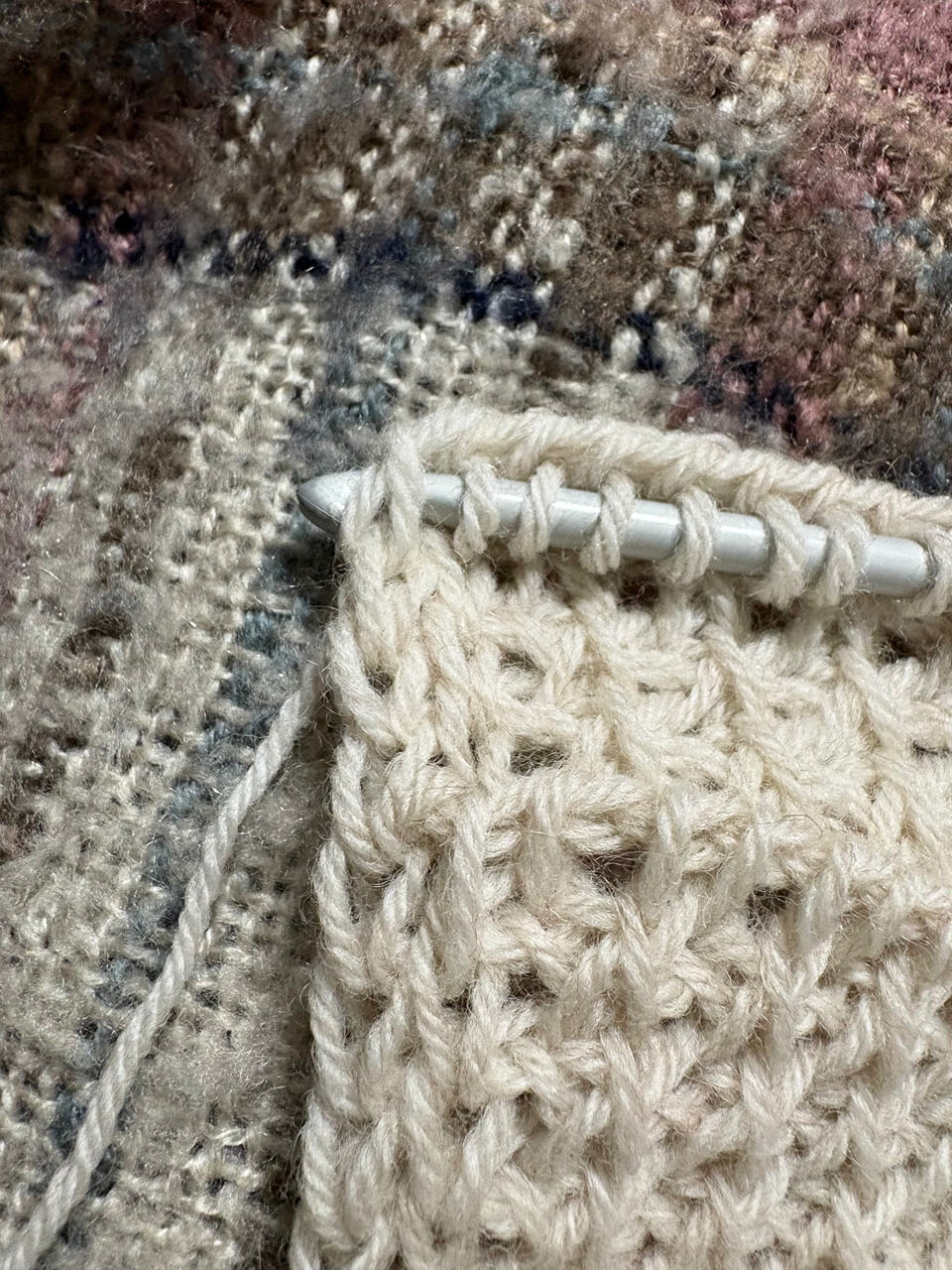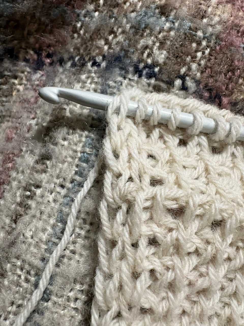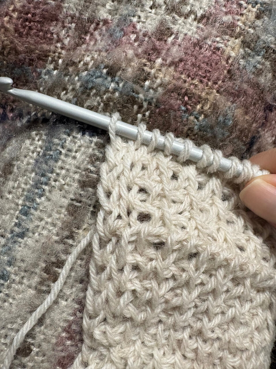 I want it to look like all the other Vs before it right? Under 2 loops but inserting in middle for knit stitch.