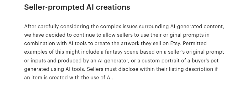 I don’t understand how Etsy can’t see how damaging this is for small creative businesses, especially since they keep claiming that their platform is for HANDmade goods and small artisans. If a program did all of the work and a person only entered a prompt, in my opinion that is not a human made product (especially since the AI would have pieced it together from other peoples pre-existing work).