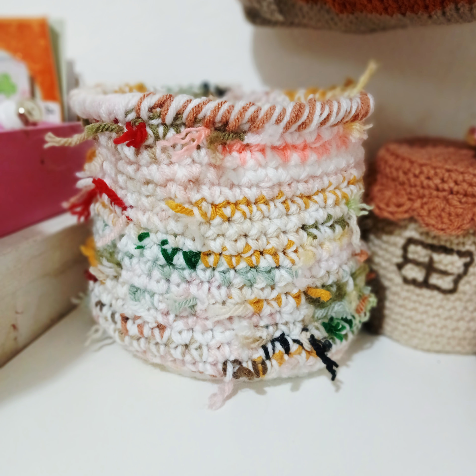 I made it out of a bunch of little acrylic yarn scraps that I tied together and I now use it to hold more yarn scraps eheh :>