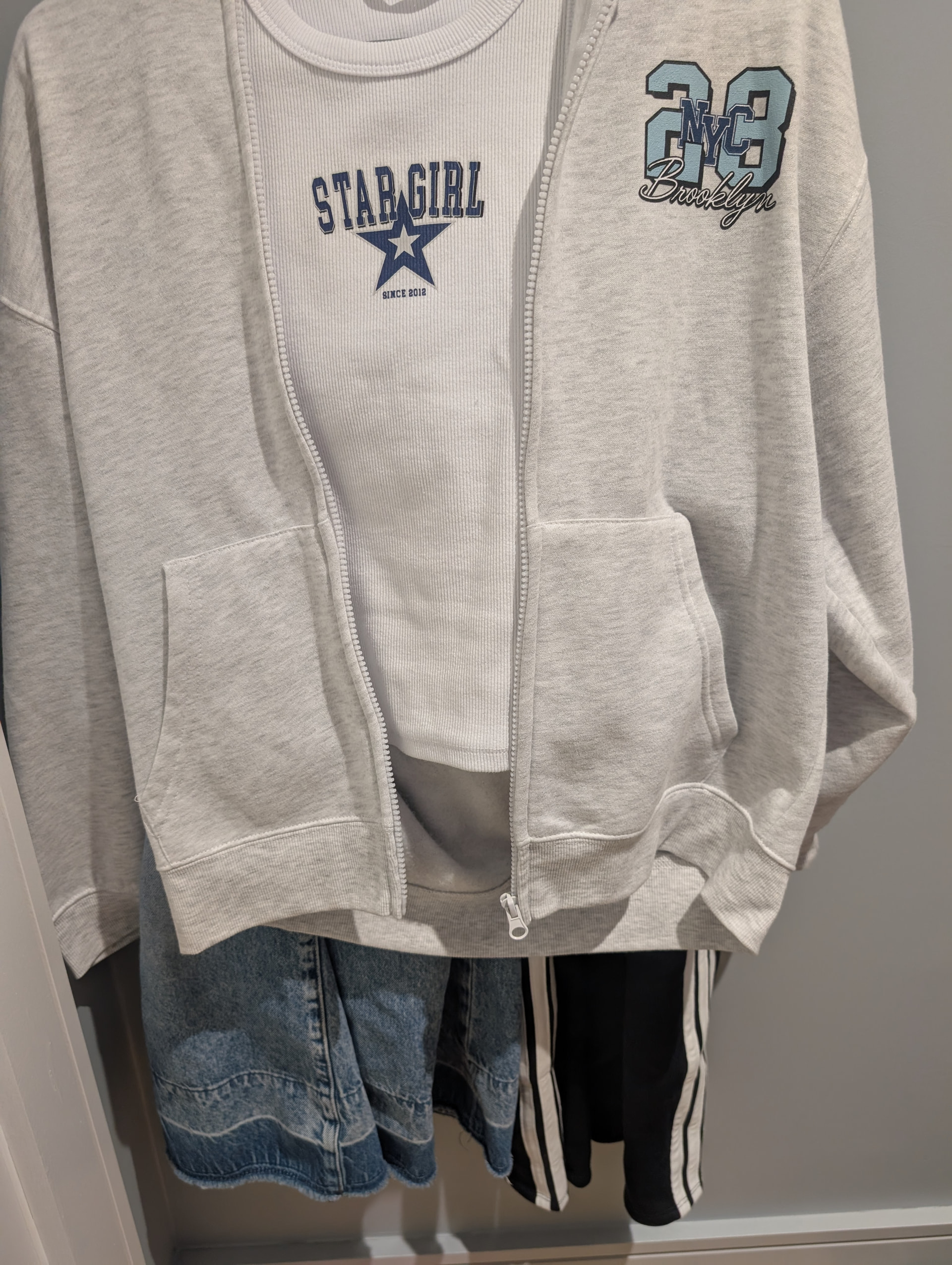 Hi guys so this is super important!so basically twomorrow I have a field trip/tour to my future high school that I’m going to next year and I rlly want a good impression so that’s mean the fit matters so I need help choosing because idk what to do I was thinking what’s in the photo but idk if I should wear the jeans or the sweat pants (srry you can’t rlly see it) I also have a gray tank top (white looks better on me) so pls help this is rlly important!!!