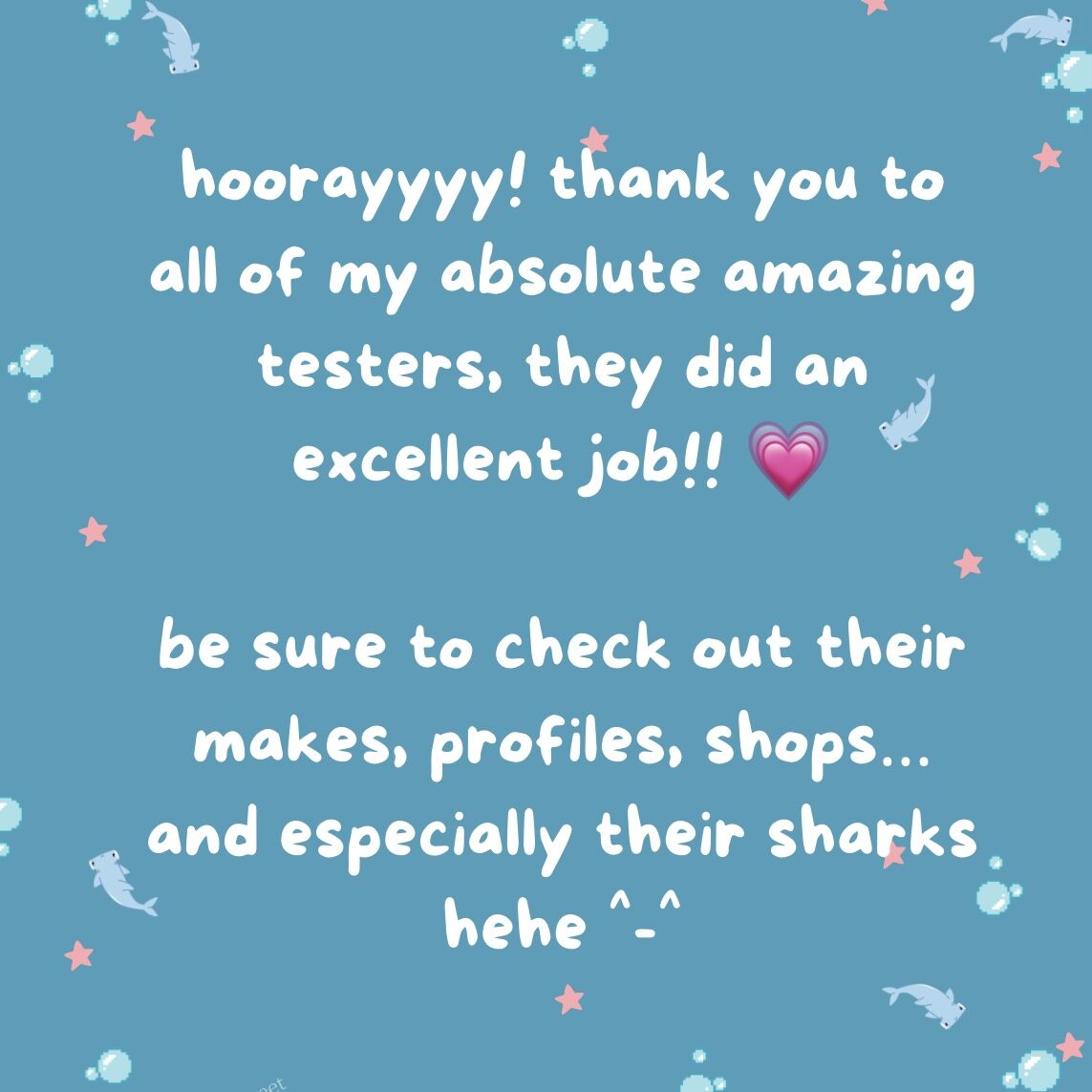 thank you to all of my testers, they did awesome by finding all of my little mistakes! you should go check out their profiles, because they’re literally so incredible!