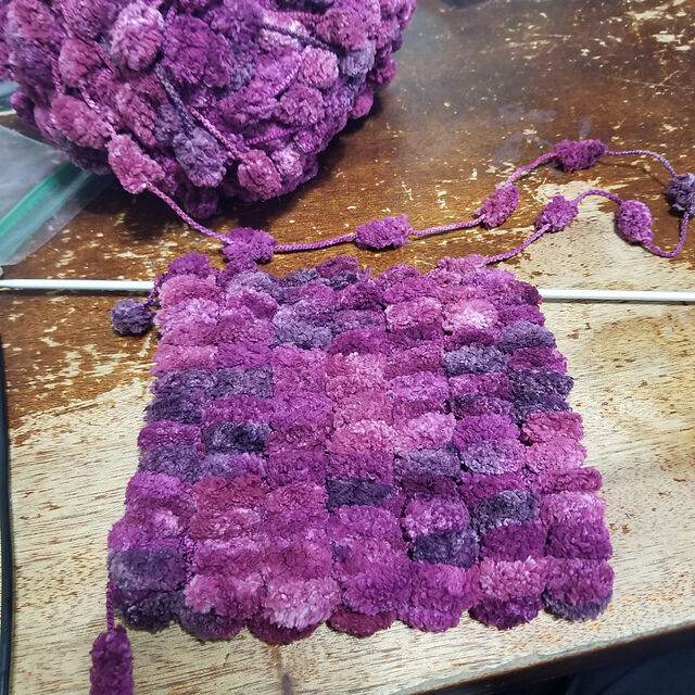 Yes, I also found some of this pom-pom yarn at a thrift store many years ago. My mum made a shawl out of it to go around her shoulders while reading in bed. It works up into such a thick, soft plush like fabric. I love the purple shades in yours. The one I got was red with beige and browns. So, no, you are definitely not a weirdo…unless we both are???