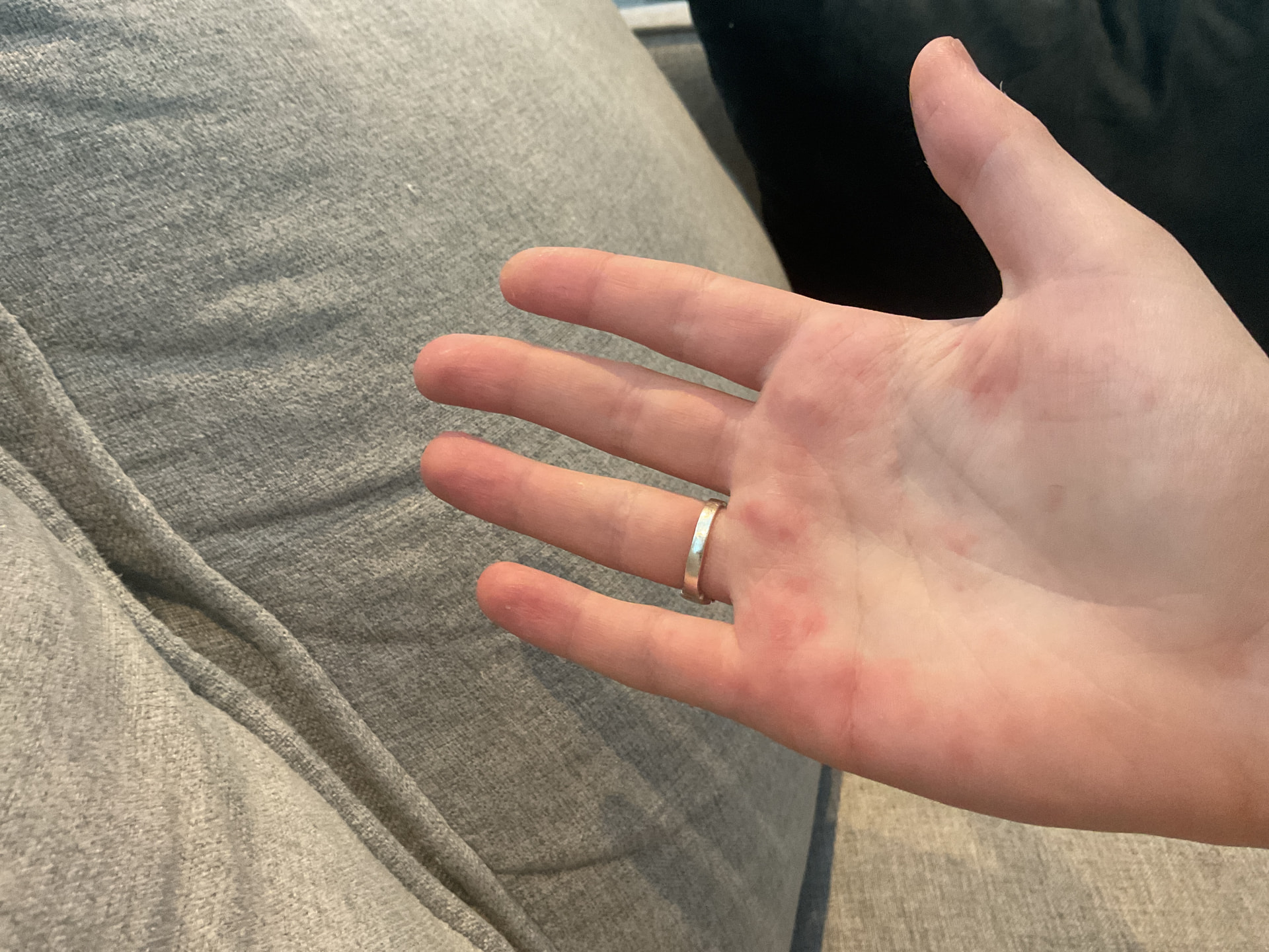 I was using plush yarn for the first time and noticed this morning that my hands are all red and puffy. Is this an allergic reaction? What do I do?