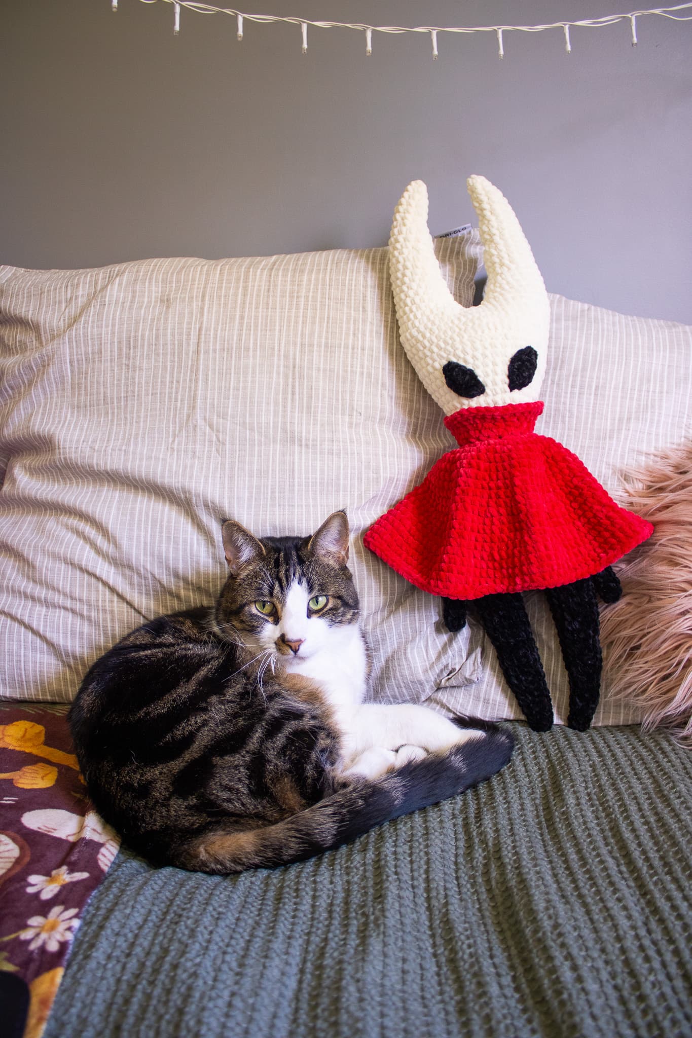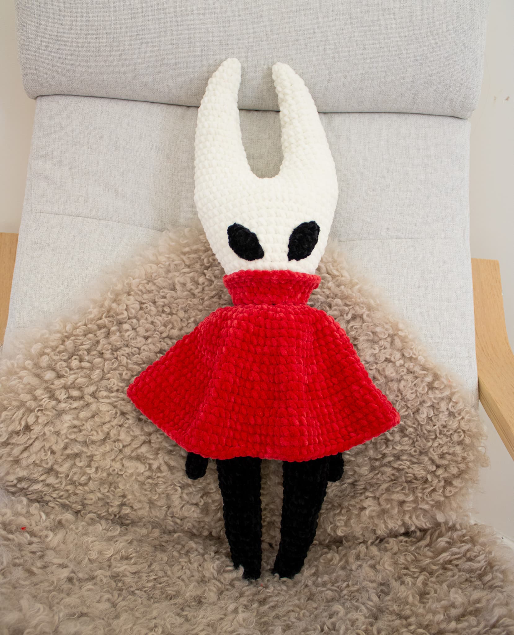 Hollow Knight was one of my favourite games ever when it came out years ago & I was so excited for Silksong’s release earlier this month! I had to make a Hornet, but I wanted her to be big so here she is - she stands at about 24.5” tall & is SO LOW-SEW that you literally only need to sew on the eyes!!!