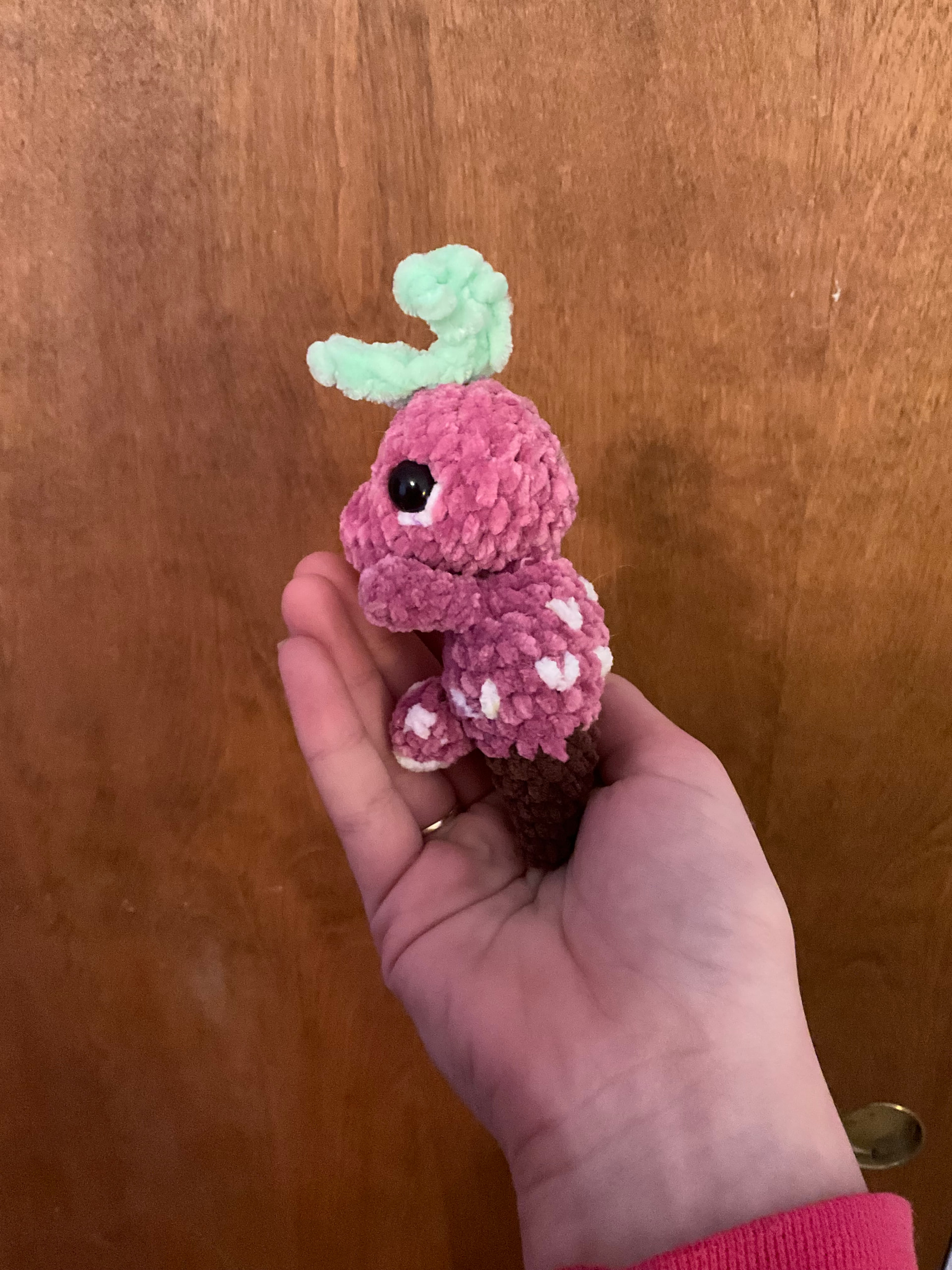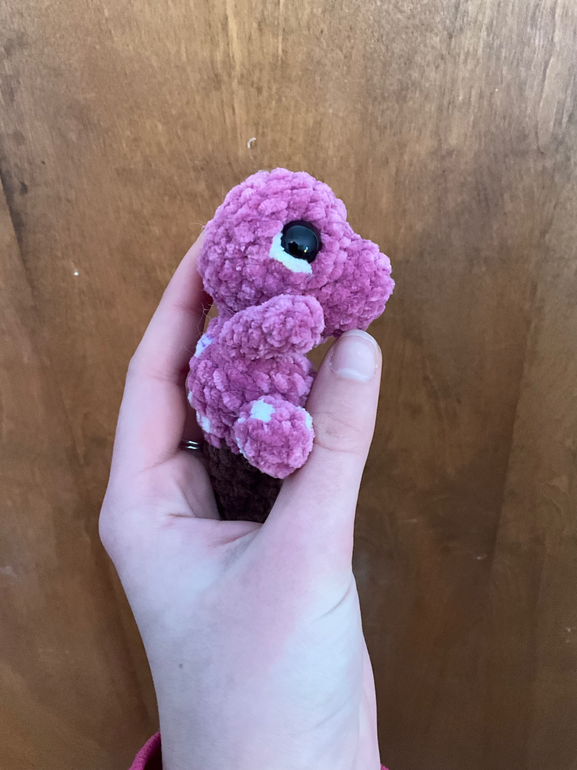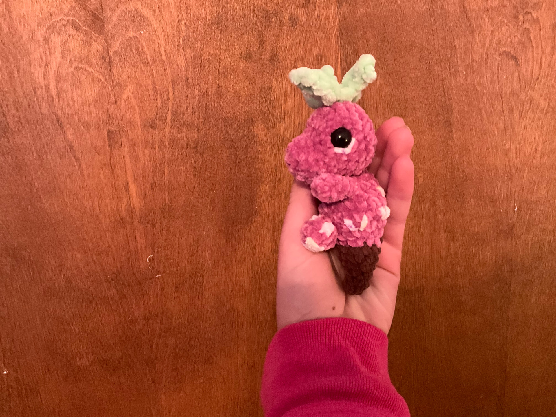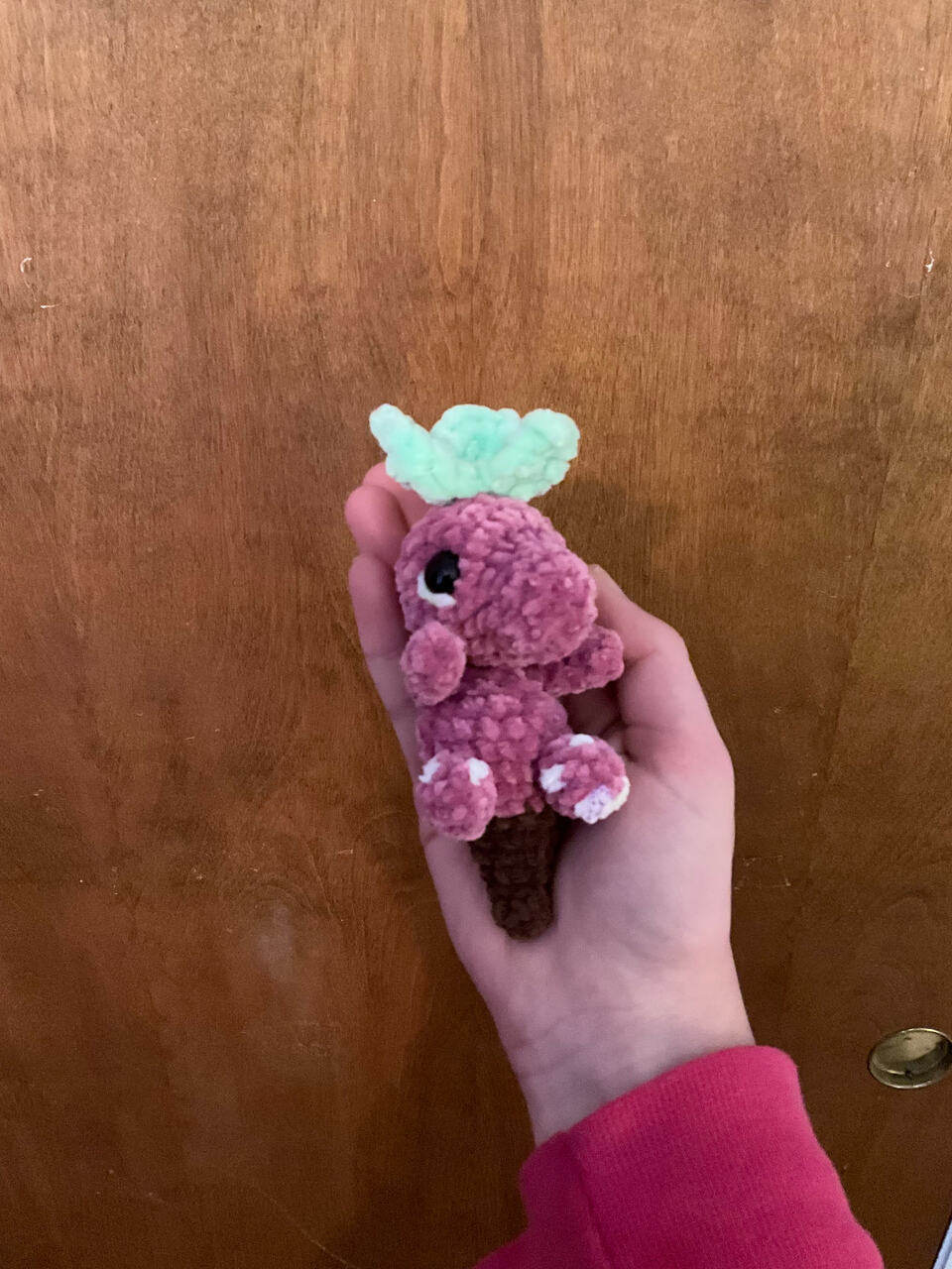 So let me explain! Instead of me working on publishing my shark+cat pattern (me procrastinating, lol) I drew a cute little strawberry Dino for me to create for Valitines day. I mostly finished the Dino today, and he’s SO cute! But when I looked at the Dino for longer, I got a sense of dasavue. I thought I had seen a pattern that looked very similar to this, but know I can’t find it. I don’t know if my memory is playing tricks on me or what…