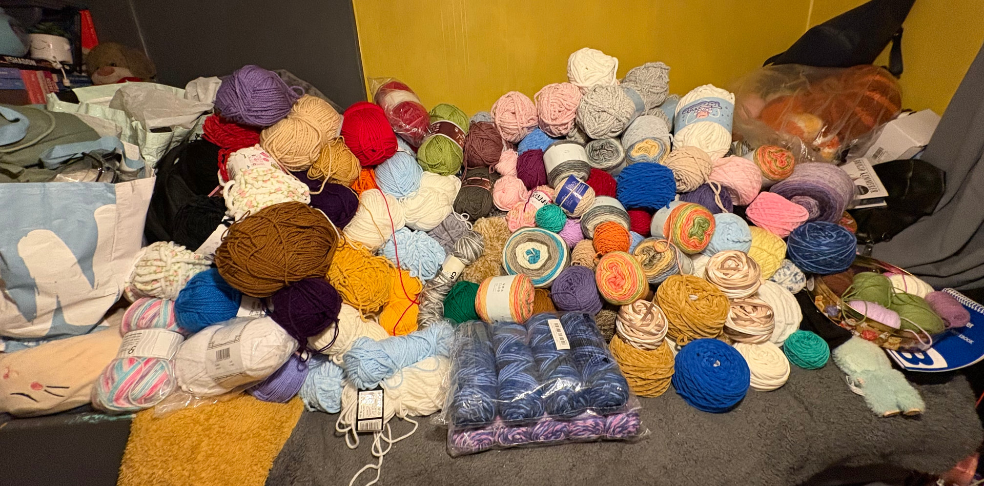 There’s a mix of dk, chunky, Aran, cotton, acrylic, faux fur, velvet, T-shirt, and other random yarn that hasn’t been identified all in this pile.