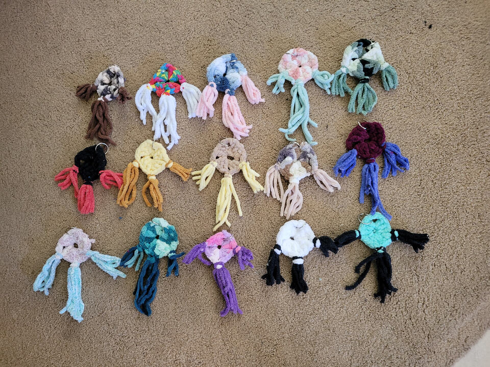 What I do is I make a granny square with only one row and add fringes to the sides and a Keychain thingy to the last side. Then I cut the fringes to my desired length. (I am going to make a pattern for these sometime soon!) What is your favorite one? Mine is the rainbow one hehe