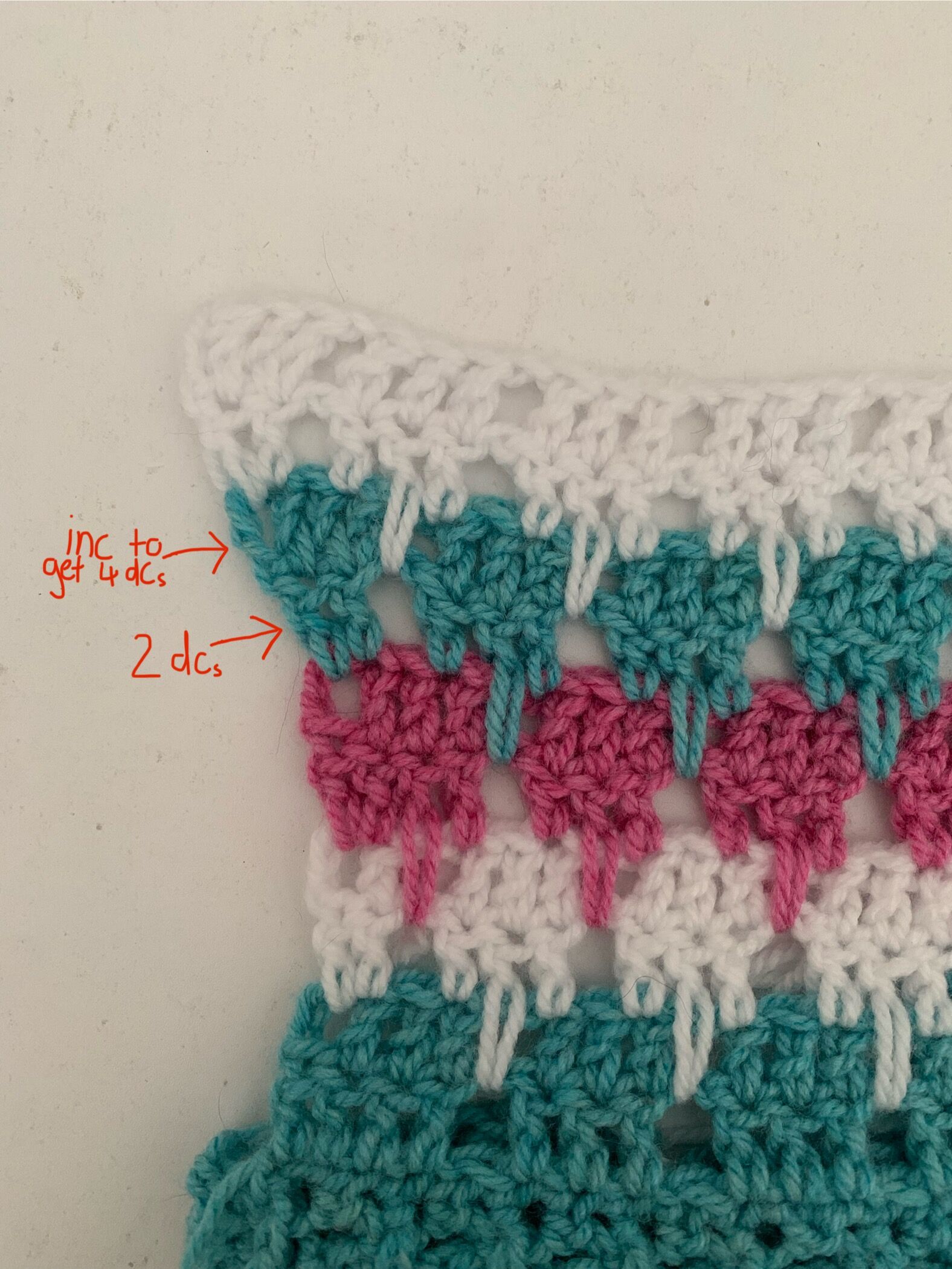 So the stitches at the end of the row are either in groups of 4 dc or 2 dc. To increase: once you’ve done the row that has the spike dcs and also start and end with 2 consecutive dcs. In the following row you increase in those 2 consecutive dcs to make it 4 dc then you follow the ‘pattern’ for the icicle stitch as if you are doing the part that starts and finishes with 2 consecutive dcs. Essentially you do the part, that has 4 consecutive dcs, twice