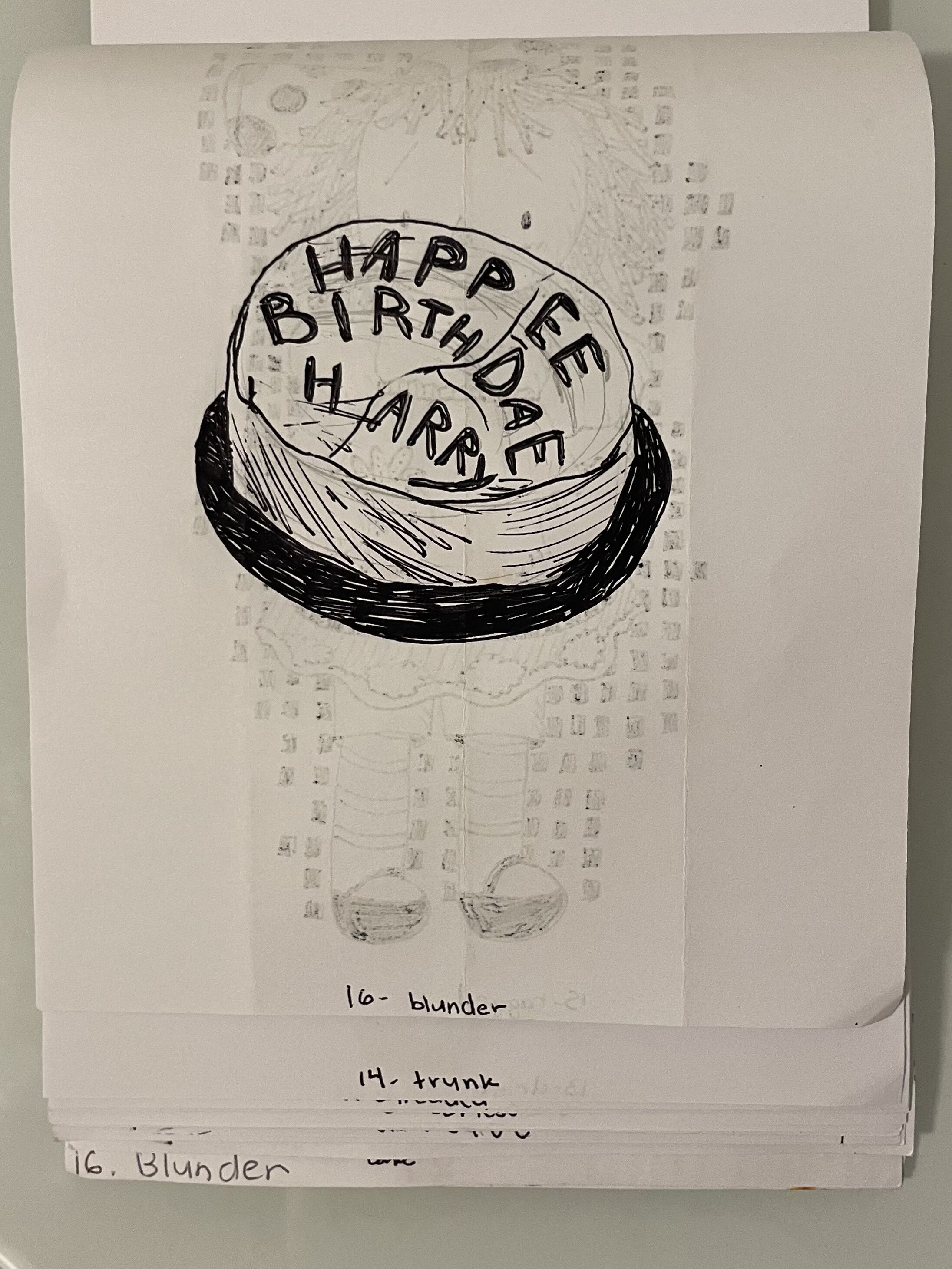 I actually did not know what the word blunder meant before this, so I had to look up the meaning, and basically it is a stupid mistake, so I drew the cake Hagrid made for Harryās birthday. It has a couple of spelling errors.
