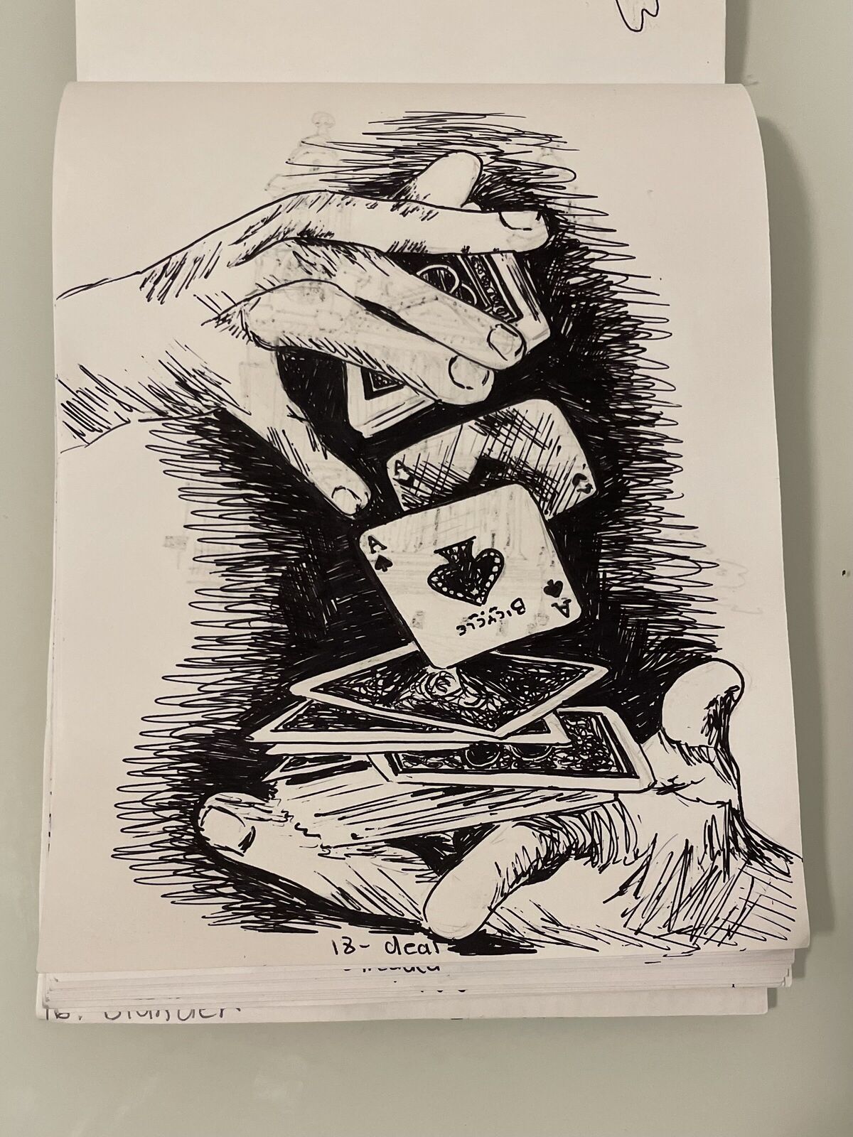 When I first though Of the word deal, I though of a sale in a store, but I didnāt know what I would draw for that, and then I remembered that you can deal cards. Me and my family have been playing lots of games with cards, mostly B.S., and not to brag, but I usually win because no one pays attention to how many cards I have left. So here are se cards getting ready to be dealed. Donāt mind some of the wonky fingers!