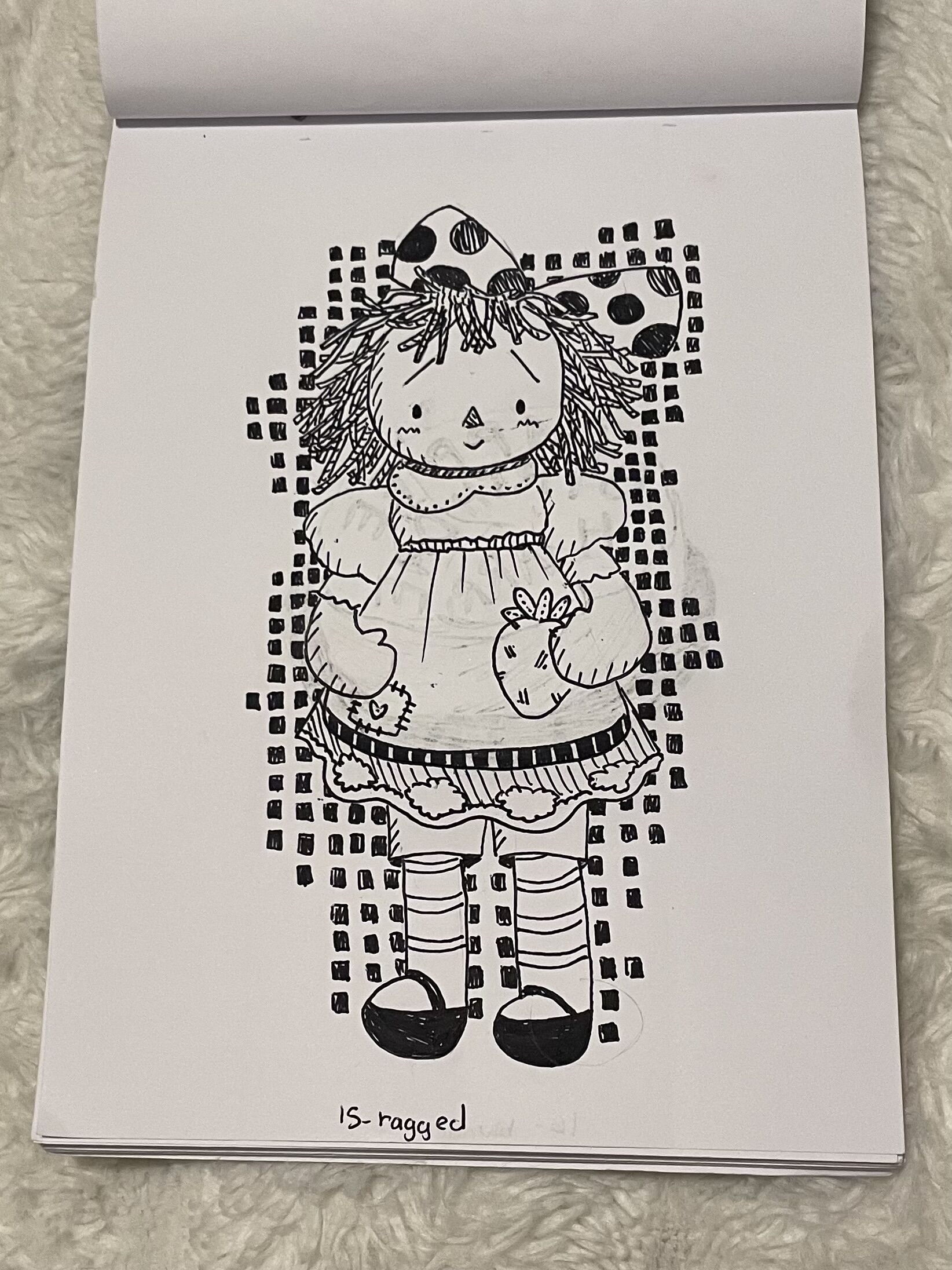 For ragged, I thought of drawing a Raggedy Anne doll and it turned out so cute! This might be my favorite Inktober drawing so far. Maybe Iāll make a crocheted version of her someday. And look! Sheās holding a strawberry!