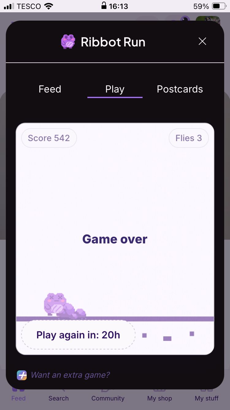 Day 2 went worse than day 1, I clicked to jump and it lagged and I didn’t jump at all and died at the first yarn ball. At least I’d managed to jump the day before. I think we need to be able to practice more than once a day to be able to get used to it. Or at least look into the bugs so that we are actually able to play and make the most of our one go a day, without having to wait 24 hours to play again. Don’t get me wrong, I like the concept, but I think in practice it’s flopped a bit ![]()