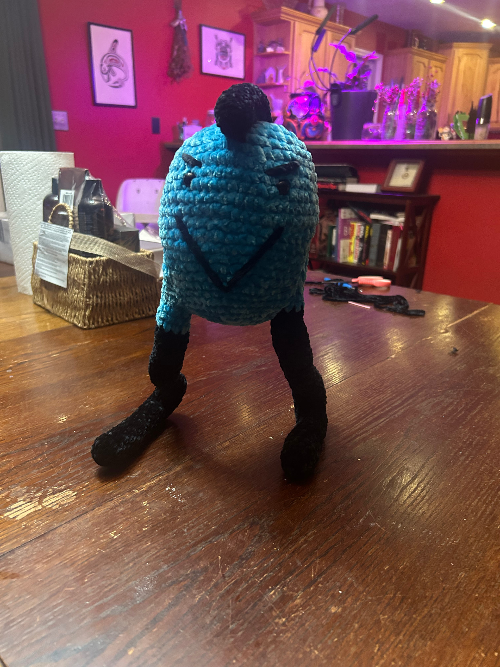 I started a crochet octopus using a pattern generated by ChatGPT (it was just to see if it would work) and I got burnt out, ended up with the head and three legs. That was two years ago. They came over, I showed his girlfriend the pieces and we started joking about combining them as they are. This is what came from it… She asked to add a mohawk, a smile and mean eyebrows. Name still undecided. No questions or anything, just wanted a place to share this funny creation!