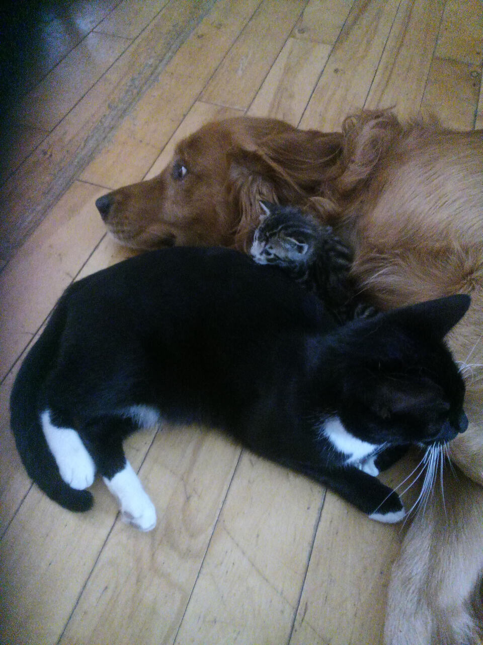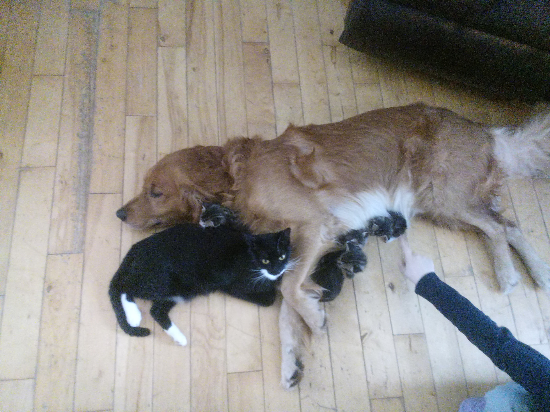 My golden retriever is literally the most gentle dog ever. He just loves the little kittens.
