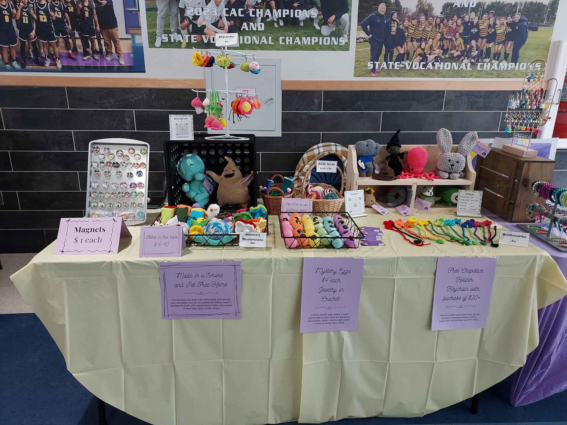 I sold: A mushroom keychain, 3 flower bookmarks, 2 star bookmarks, a hacky sack, a blob in a hat plush, flower buddy, oogie boogie (my biggest sale, $30), Elphaba, a baby chicken, 3 sensory mushroom poppers, 2 bracelets and 2 chapstick holders.