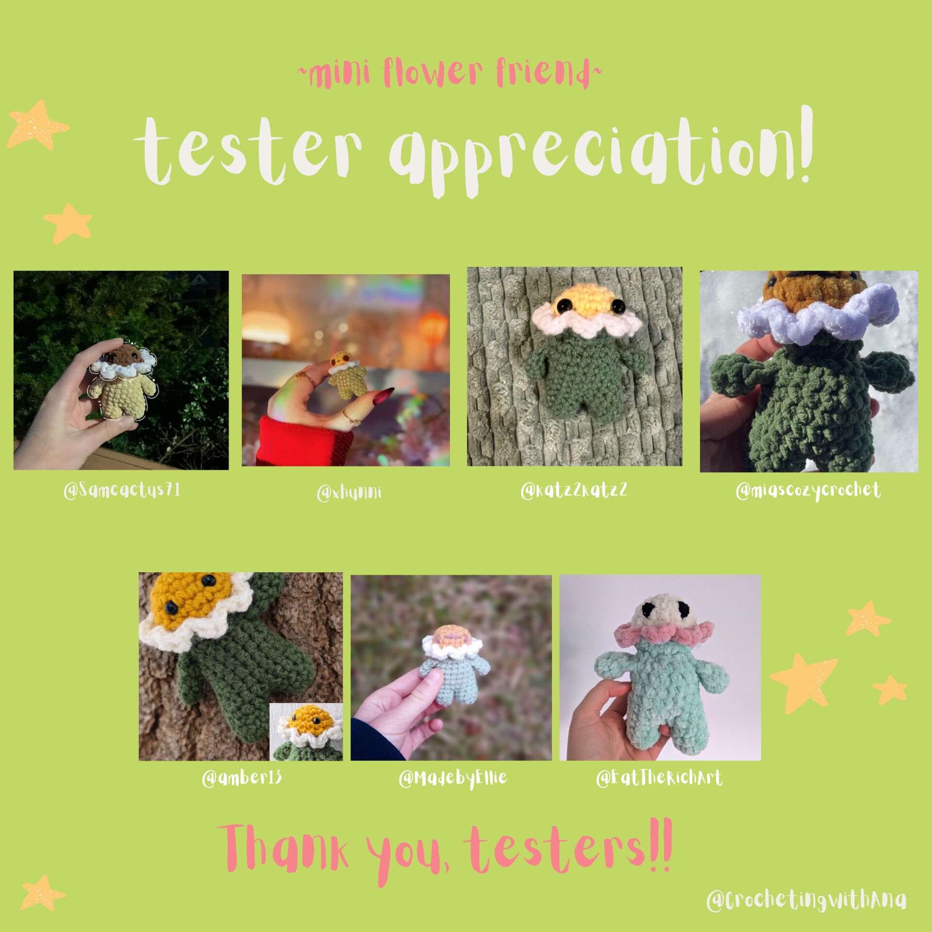 pattern out for you guys! I’ve made a mini version of Fernando the Flower Friend, a very liked pattern on my shop. And I’ve had seven wonderful testers who helped make the pattern even better! Here they are: @MadebyEllie @xhunni @amber13 @katz2katz2 @EatTheRichArt @miascozycrochet @Samcactus71 ! Thank you all so much you did a great job!