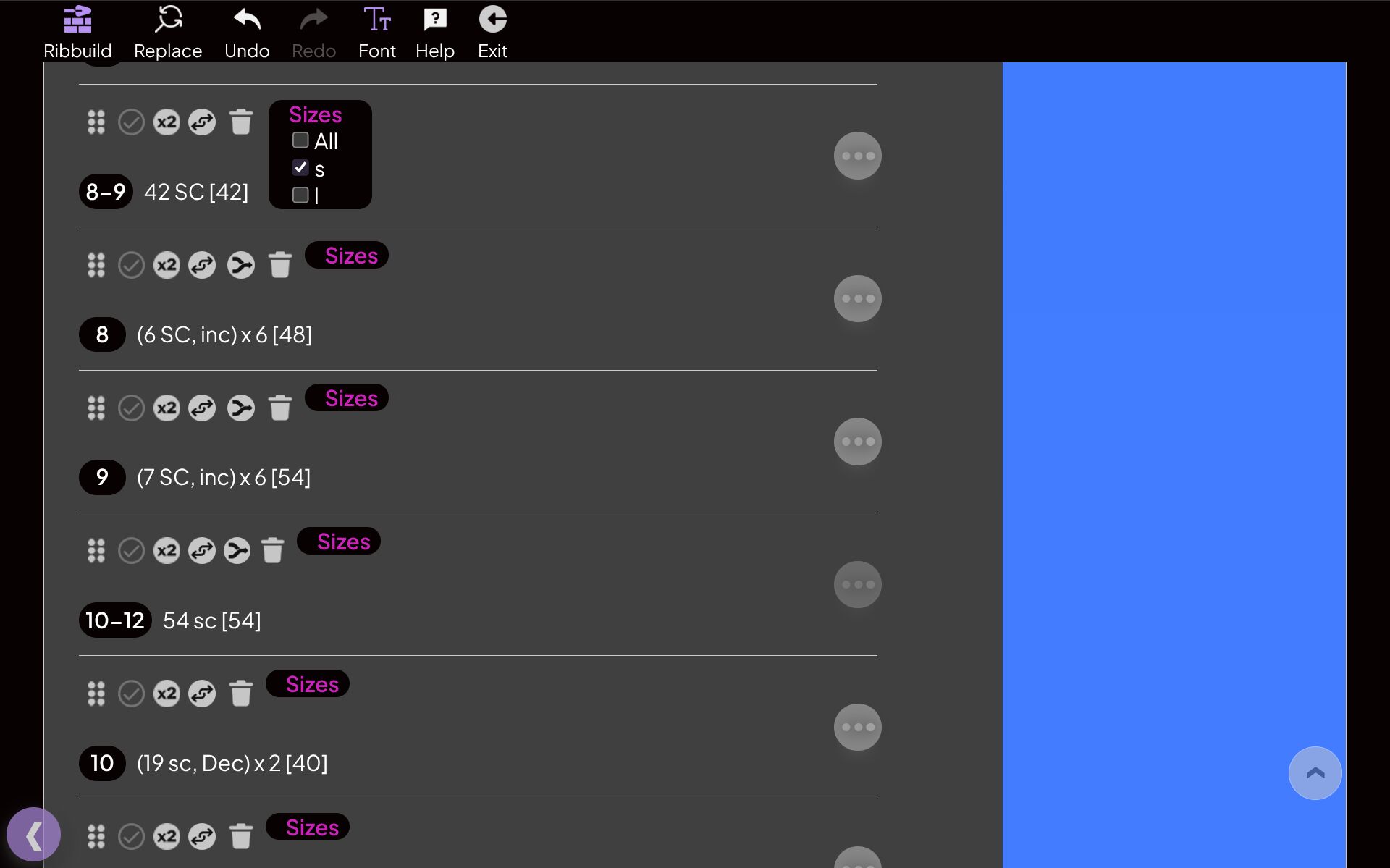 I’m working on a pattern. I made one size, and now adding another. I have to add extra lines for the larger size, but it is hard to keep track of which is which, without checking. Could you make the word “Sizes” a different color for each size?