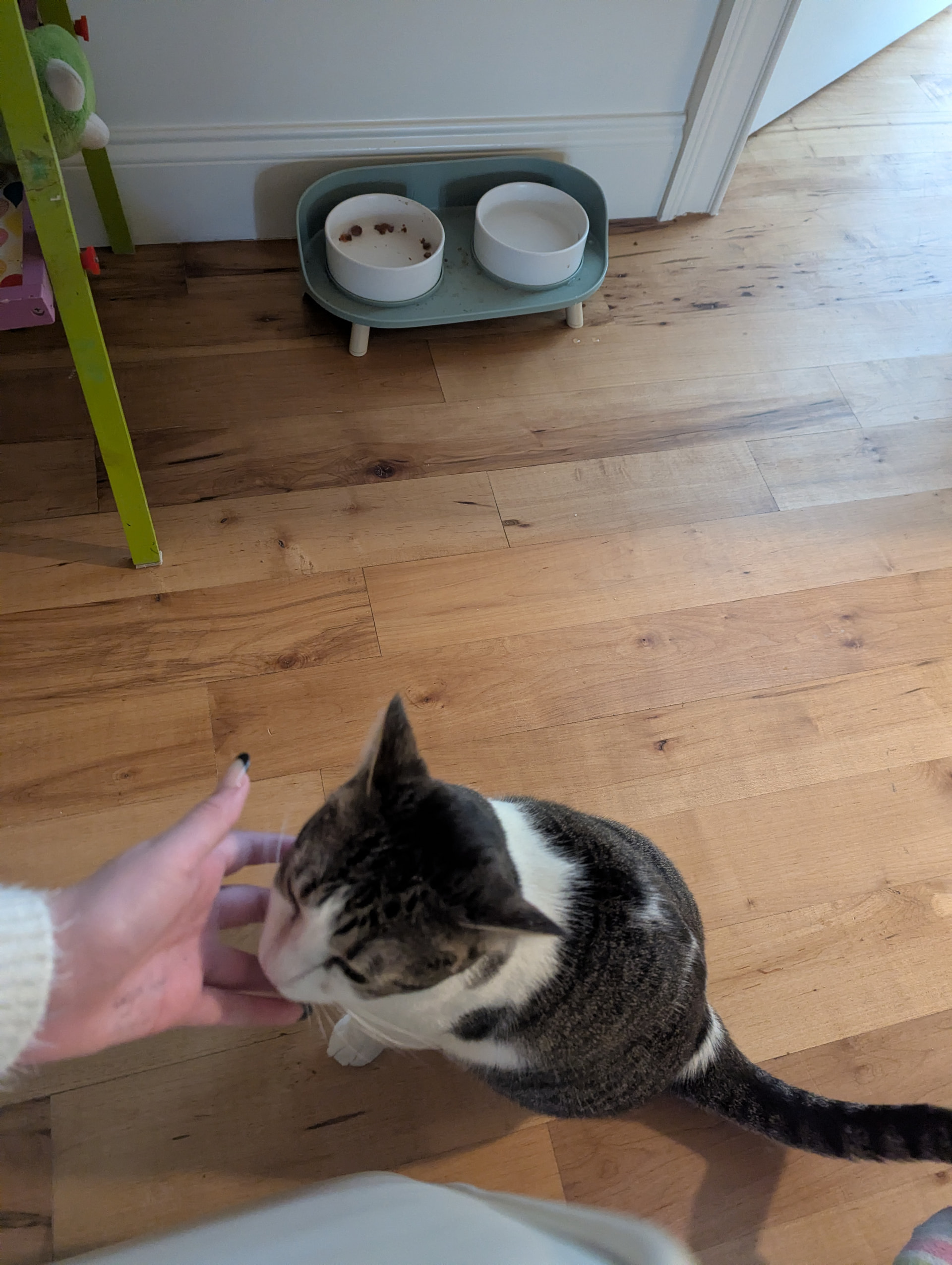 The adult is Maple who is super sweet a cuddley but hates new people. The kitten is Fern and she is either super tired or way too energetic.