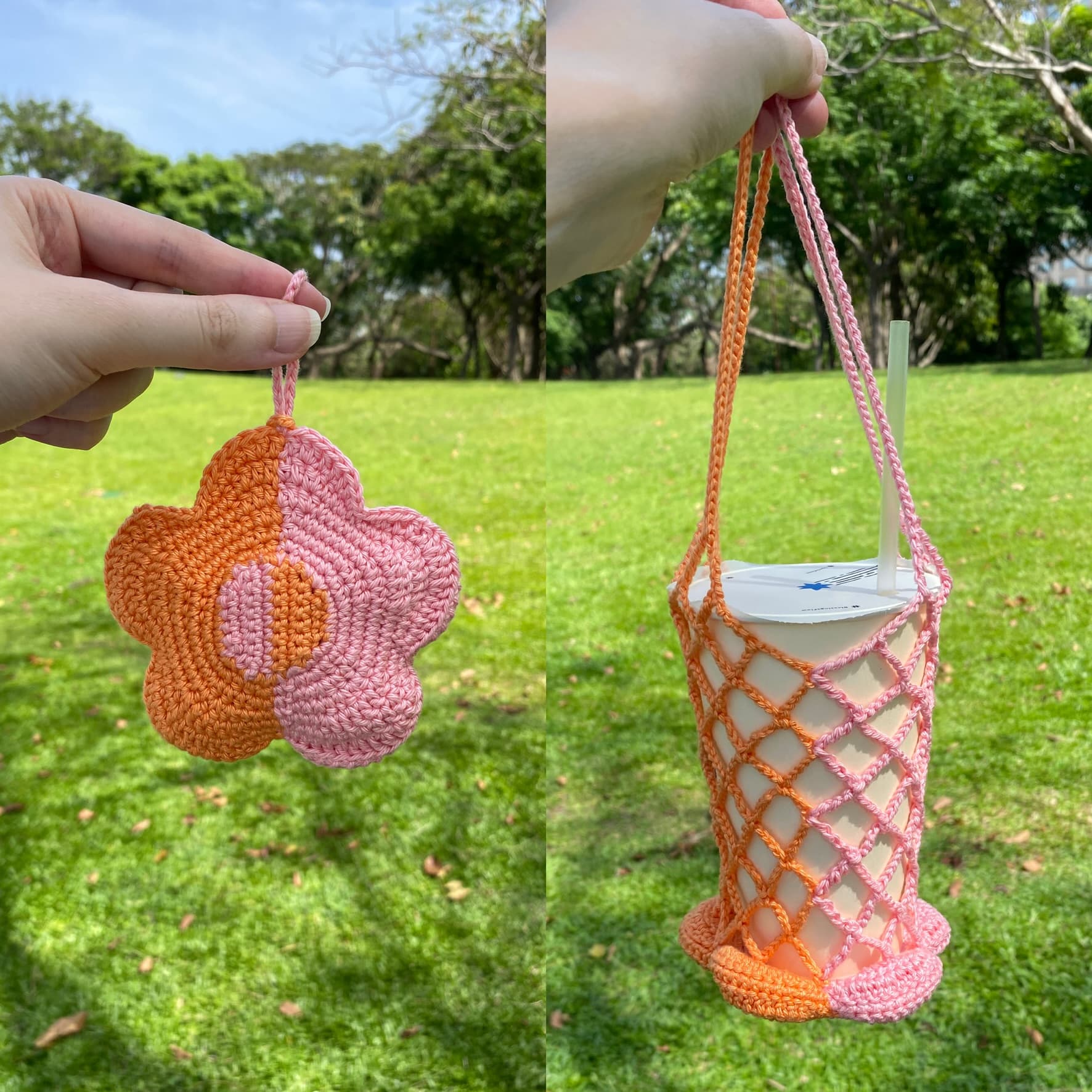 This flower pattern creates a foldable drink holder that fits iced coffee, bubble tea, or water bottles.