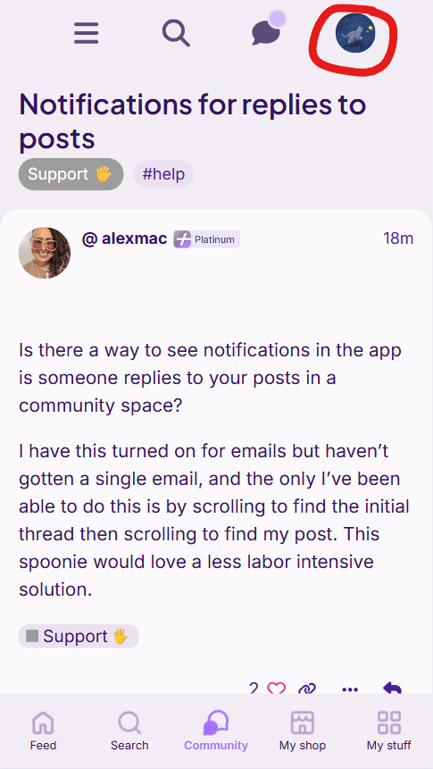 Is there a way to see notifications in the app is someone replies to your posts in a community space?