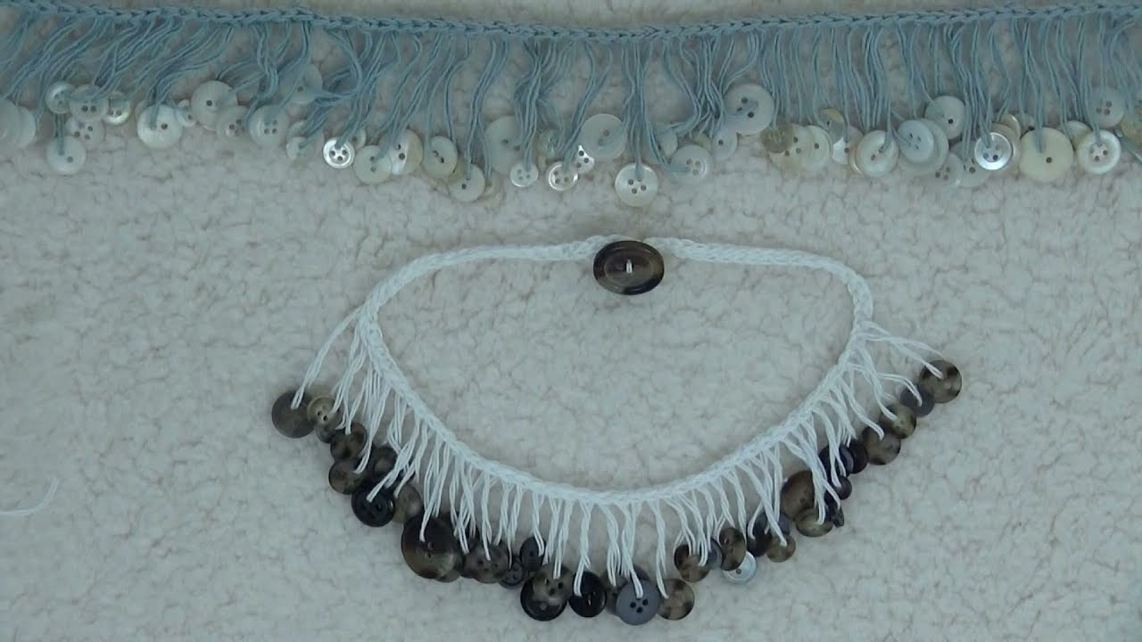 Twisted Yarns on Youtube has a video on how to crochet a button necklace, the lacing doesnt look as pretty as this picture, but it does show how to put the buttons on ![]()