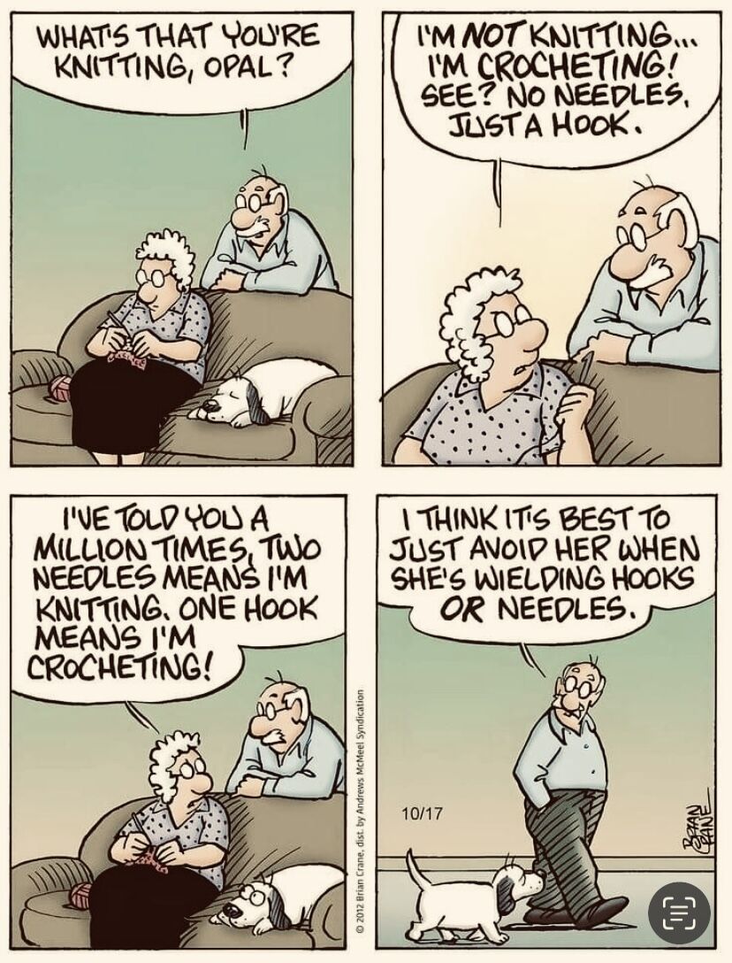 My dad still doesn’t get it… He asks me “hi what are you knitting” “dad I’m not knitting I’m crocheting” “look here knitting and crocheting are the same thing. Its just putting loops through loops”…
