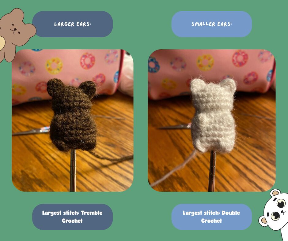 I’ve made 2 bear bases (one in white, one in brown) and I was experimenting with the ear sizes. So, which ears should I include in the pattern, larger ears (brown bear), the smaller ears (white bear), or should I just include both ears, but make 2 separate sections. ![]()