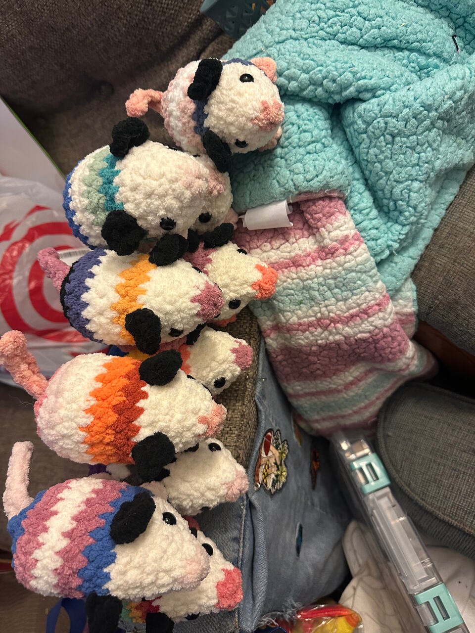 Here’s a small batch of some pride possums that I’ve been making for my city’s pride festival next year! Pride is always my biggest market so after my fall market season ends I spend the winter inside under a warm blanket crocheting away making inventory. I’m horrible at taking pictures of my finished projects so I’m hoping posting here will help me remember