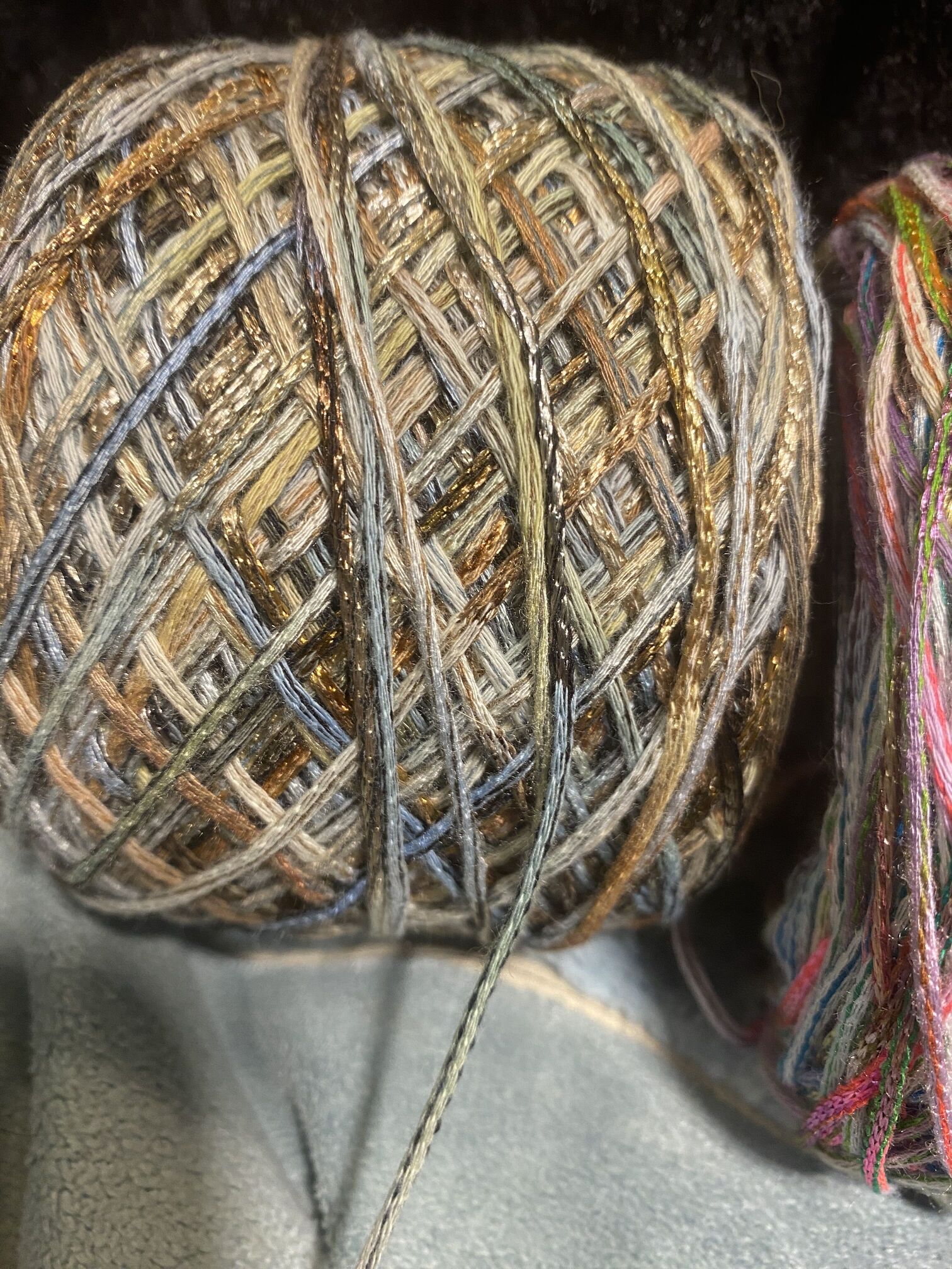 The brownish is 2675 yards of Tahki yarn Earth and Sky and the pinkish is same brand color way Wildflowers 2675 yards.